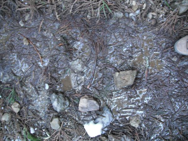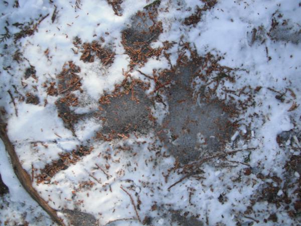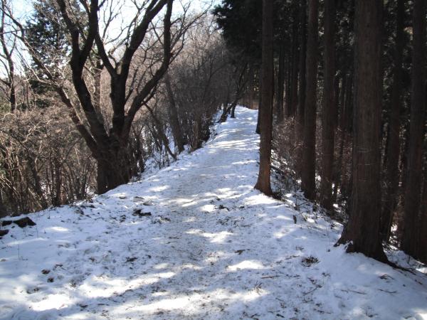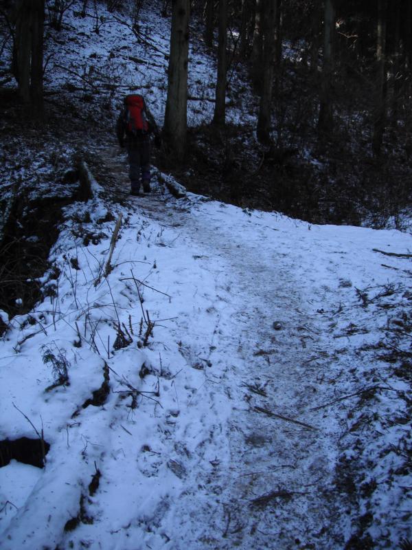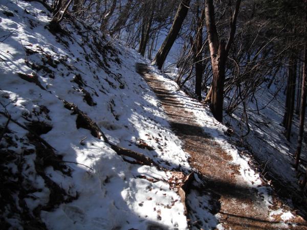 今回は、陣馬山から高尾山に行ってきました。想像していた以上に雪が残っており、アイゼンの装着を早めにしている方々が多く見られました。凍結箇所はもちろんですが、ヌカルミで滑ってしまうほどひどい状態です。靴の裏には5センチ程泥がへばりつき、重たく感じます。ズボンのすそも泥だらけになってしまいました。景信山から高尾山までは、アイゼンはなくてもよさそうです。ですが、軽アイゼンの携帯をお勧めします。4号路(吊り橋コース)は、残雪や凍結箇所があるので、アイゼンの装着などの注意を促す看板がでております。