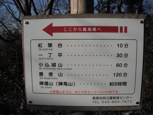 - 高尾駅(0:40)→陣馬高原下駅(1:00)→陣馬山(0:20)→明王峠(1:15)→景信山(0:20)→小仏峠(1:10)→高尾山頂上(0:30)→ケーブルカー乗り場