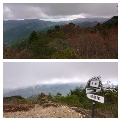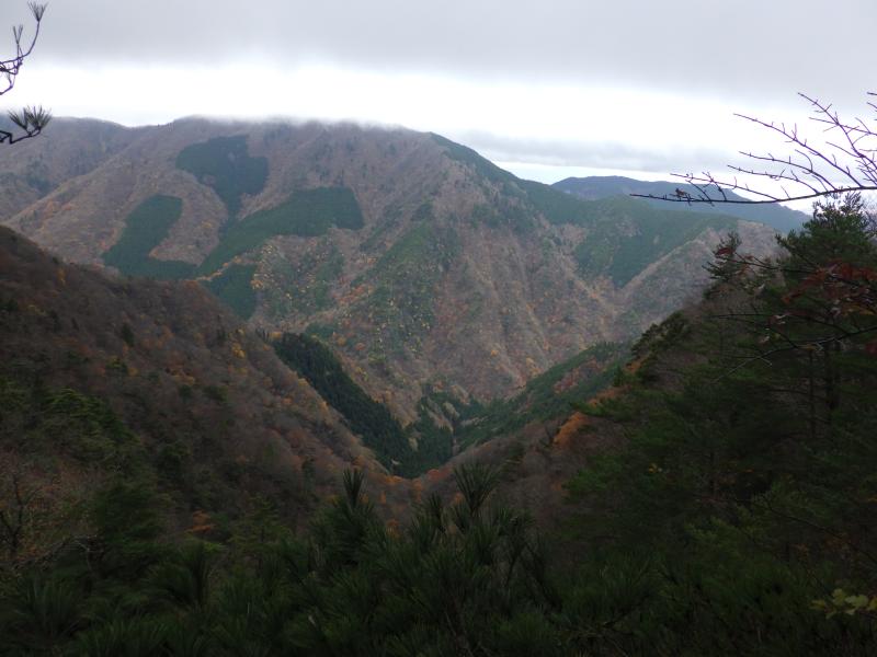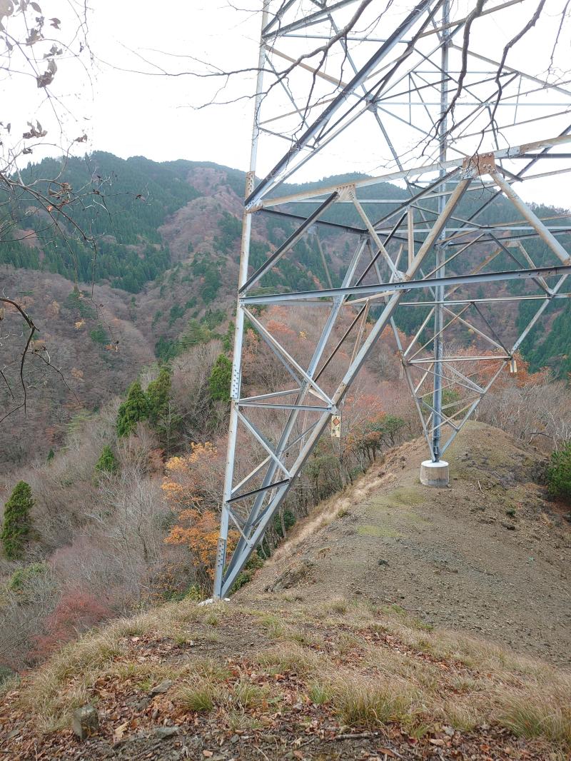 今回はこの難所の尾根を通り、銚子ヶ口まで進みました。登山口からしばらくは送電線保守道を進みますので、お馴染みの黒い階段があります。落葉した落ち葉の登山道を進むと傾斜が増していき、最初の急登がでてきますが、後から考えるとここは序の口といった所でした。丸山、送電線下の庭戸山で緩やかなピークを越えると、最初のヤセ尾根が出てきます。ここは崩れて木の根がむき出しになったような嫌な場所でそれほど怖さはありませんが、小雨が降り出して、一層暗い雰囲気になります。その先はまた樹林帯の急登が続き、気が付けば展望がなくひっそりした黒尾山でした。