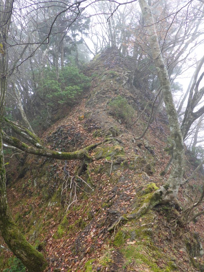 この悪場を越えると、今度はまとわりつくシャクナゲ帯が続き、しだいに普通の尾根に変わっていきます。ガスがかかっているので見えませんが、まだまだ銚子ヶ口の主稜線まではアップダウンが小刻みに続き、長いです。