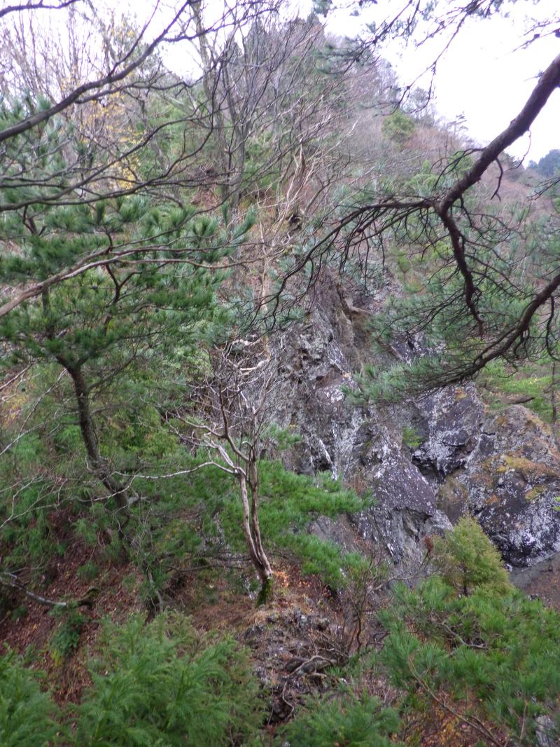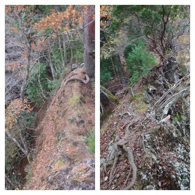 黒尾山からの急な下降からはじまり、ヤセ尾根の登り下り、黒尾山の最高点を越えると、核心の崖部分。とにかく右側が岩場で切れていて、稜線通しに行くのかと思えば、何も手掛かりのないトラバース、ここが怖い場所。短い区間なので爪先に力を込めて、一気に抜けてしまいましたが、ひやひやものです。もしかししたら、大きく下部を巻いていくのかもしれませんが、そっちも悪そうでした。