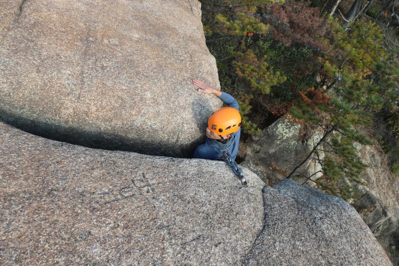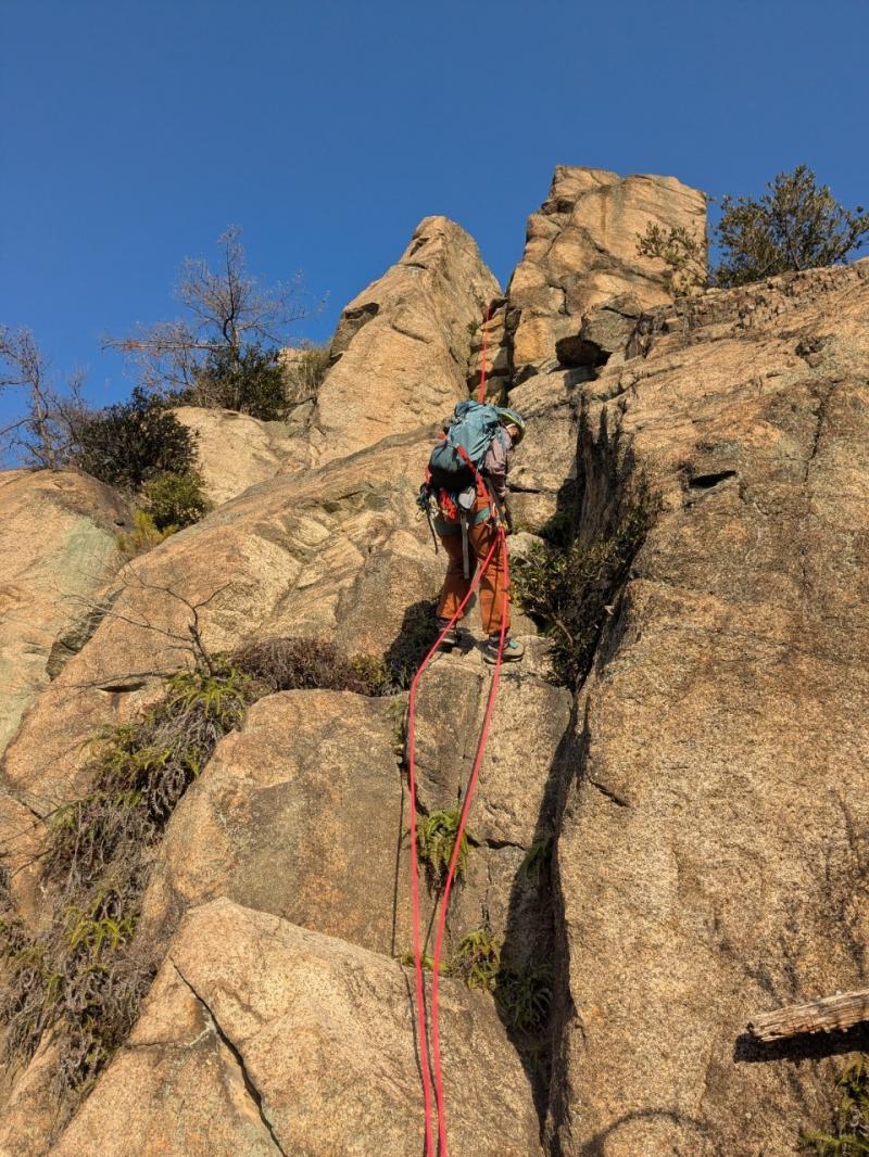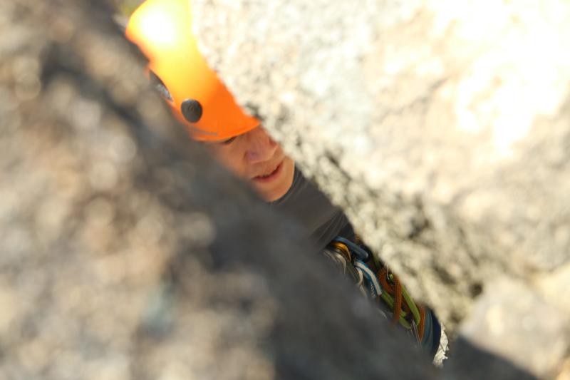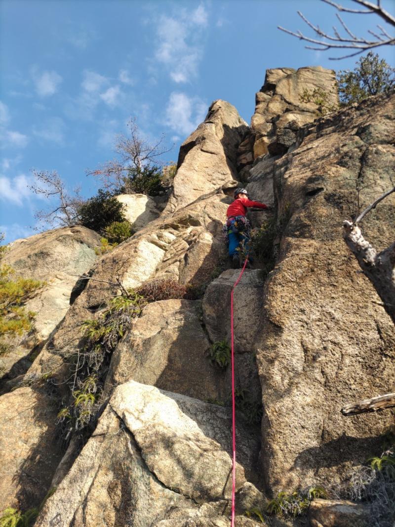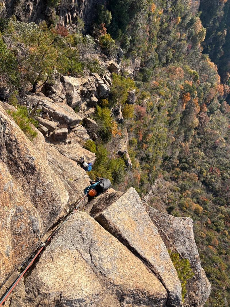 三ピッチの入門のマルチになりますが、最後の乗り越えがクラックムーブになりやや難しく感じました。それぞれ皆わりとつまずき、岩によってのムーブの難しさと藤原ガイドのアドバイス次第で簡単に登れ、それぞれの岩によってムーブがあるんだと学びました。
