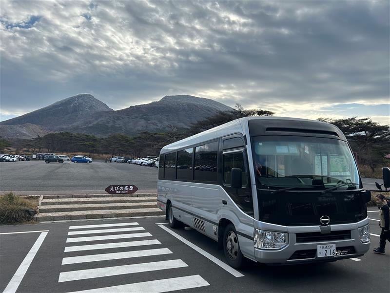宮崎西ICから高速道路に入り、途中霧島SAで小休憩をして小林ICで降りてからは1本道でえびの高原へ!スタートしてから約2時間で登山口近くの駐車場へ到着しました。(小林市側からえびの高原へ行くのは平日は通行止めです。土日の9:00~17:00のみ通行可能です。ご注意ください)