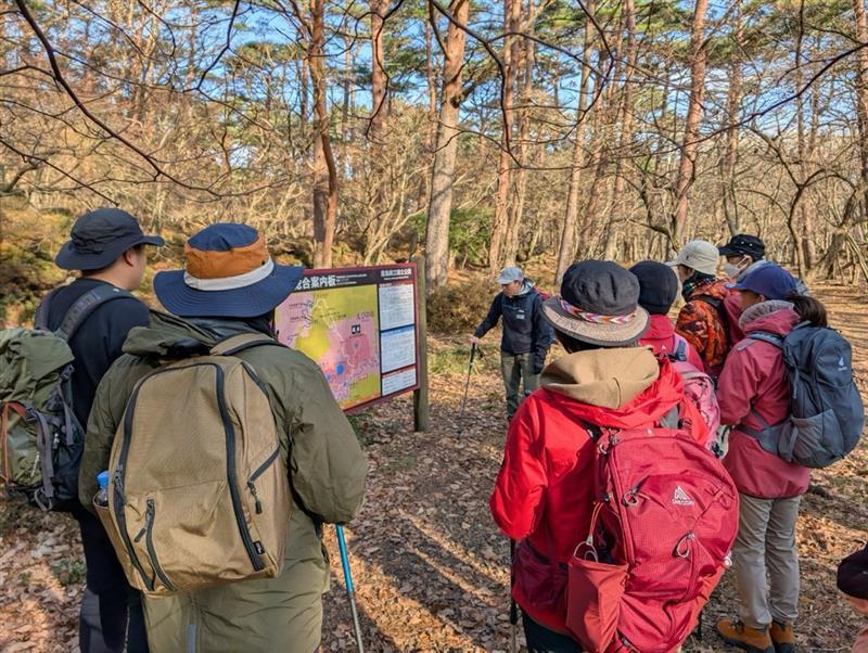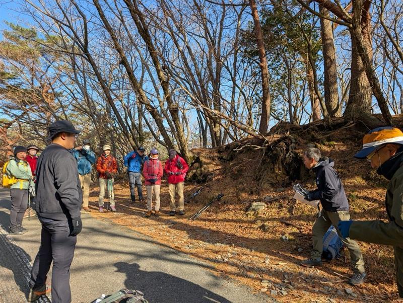 そのあとはまだゆっくりしたいところですが、片づけをしてから再び山頂標識のあるスペースへ移動です。ここからは田中ガイドの歩き方講座が開講です。