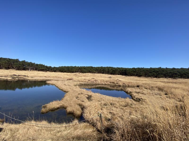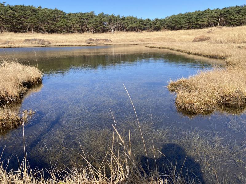 「周回が終わったら山ごはんタイム♪カレーが待っていますよ!」と告知していたこともありみなさん頭の中はカレーモードになっていたようです。約40分かけて周回して、甑岳の山頂標識に戻ってきました。標識の脇にある下山道を5分ほど下ると火口内の湿原に到着しました。