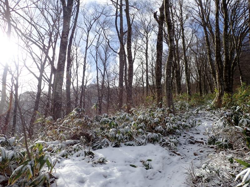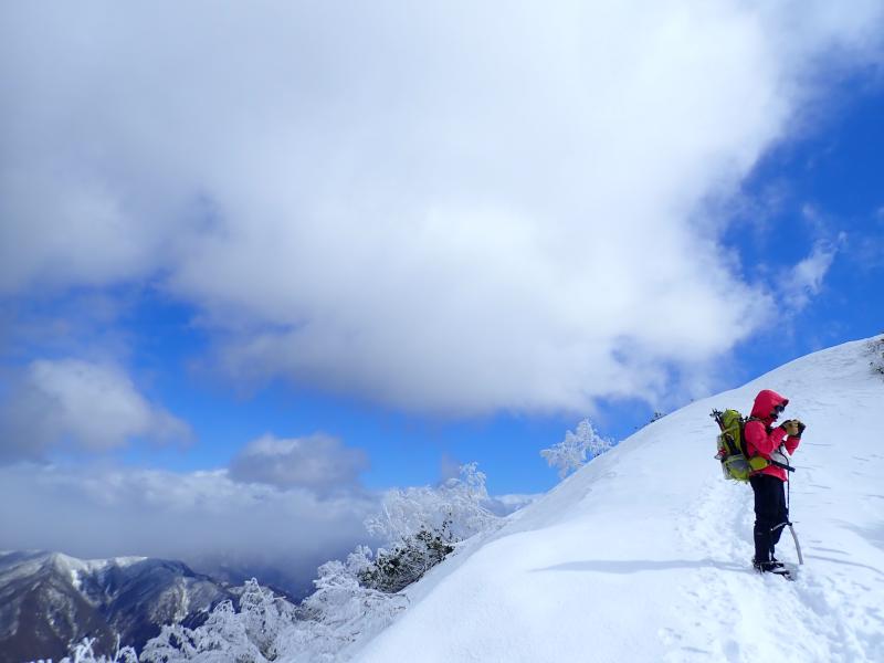 シャクナゲ平手前は急登、雪少なめもあり、しっかりアイゼンでないと滑りそうです。