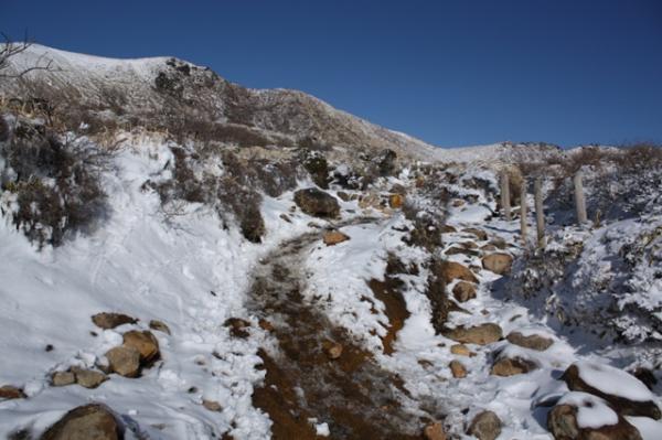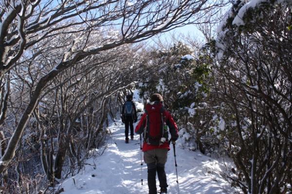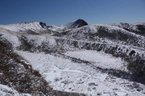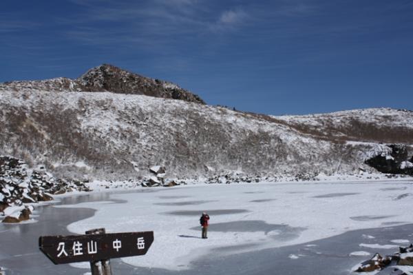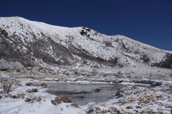 本当に気持ちのよい天気でした。雪もふかふか、足もスタスタ歩けるくらい登山道も歩きやすい状態でした。御池の湖がしっかり凍っており、乗って遊びました。いつもこんなに天気が良ければより楽しいだろうなあと思いました。アイゼンは所により滑りますので必須です。中岳下の御池はカチカチに凍ってましたので、渡って楽しめました。今から暖かくなると、割れる事があると思いますので、気を付けて下さい。