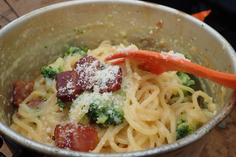 卵とチーズでほぼカルボ、ベーコンで味が締まって、もうこりゃうまい。