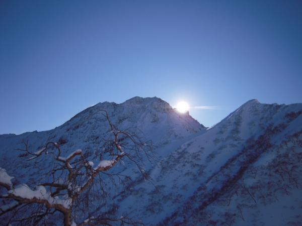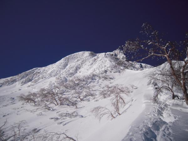 コルまで降りて谷筋を下りますが、サラサラの滑りやすい雪で稜線は注意が必要。