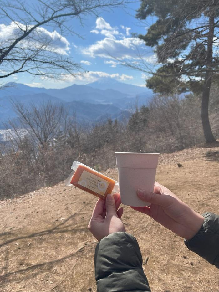 百蔵山は山梨県が選定する秀麗富嶽十二景・七番山頂で、頂上からどどーんと富士山が見えます。ちょっと雲がかかっていましたが、見事な富士山が見れました。頂上は広くベンチもあるので、富士山を眺めながらお昼ごはんを食べ、コーヒーを楽しみました。日差しは暖かいのですが、やはりじっとしていると寒いのでテルモスのお湯でささっとコーヒーを入れて正解でした。