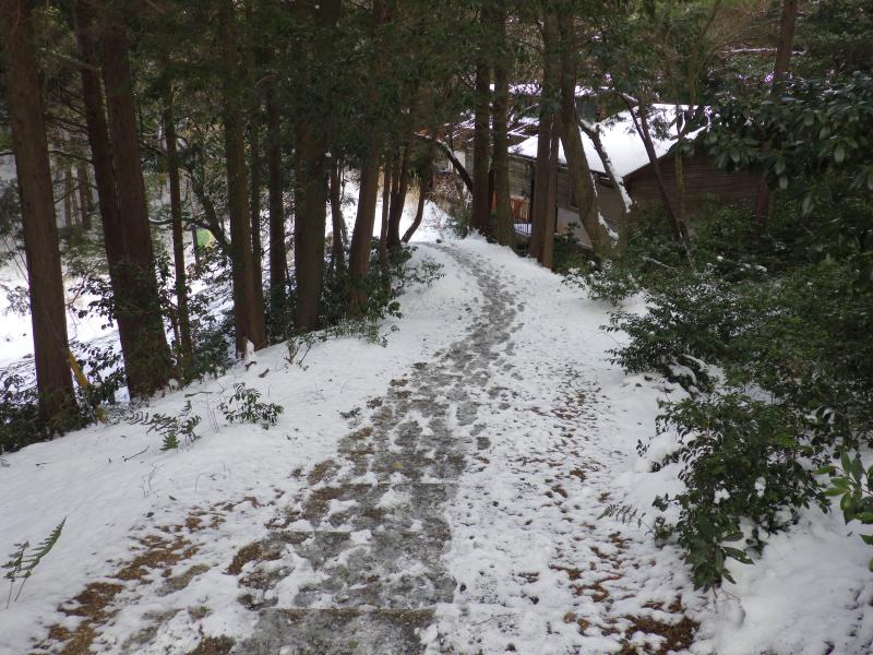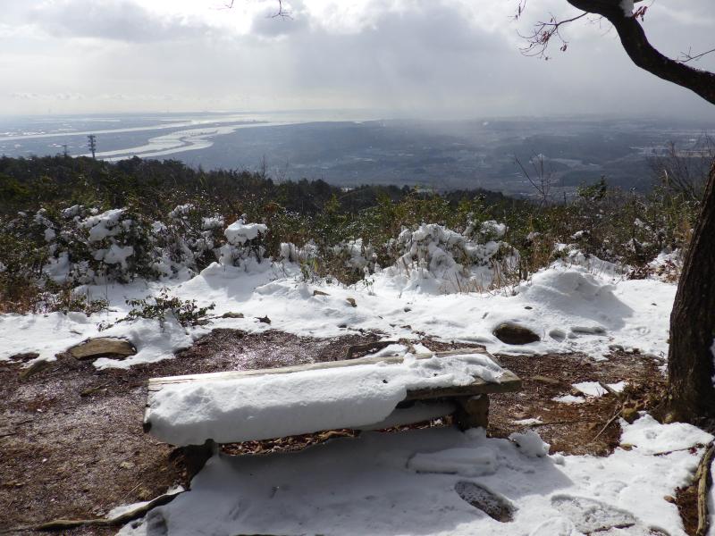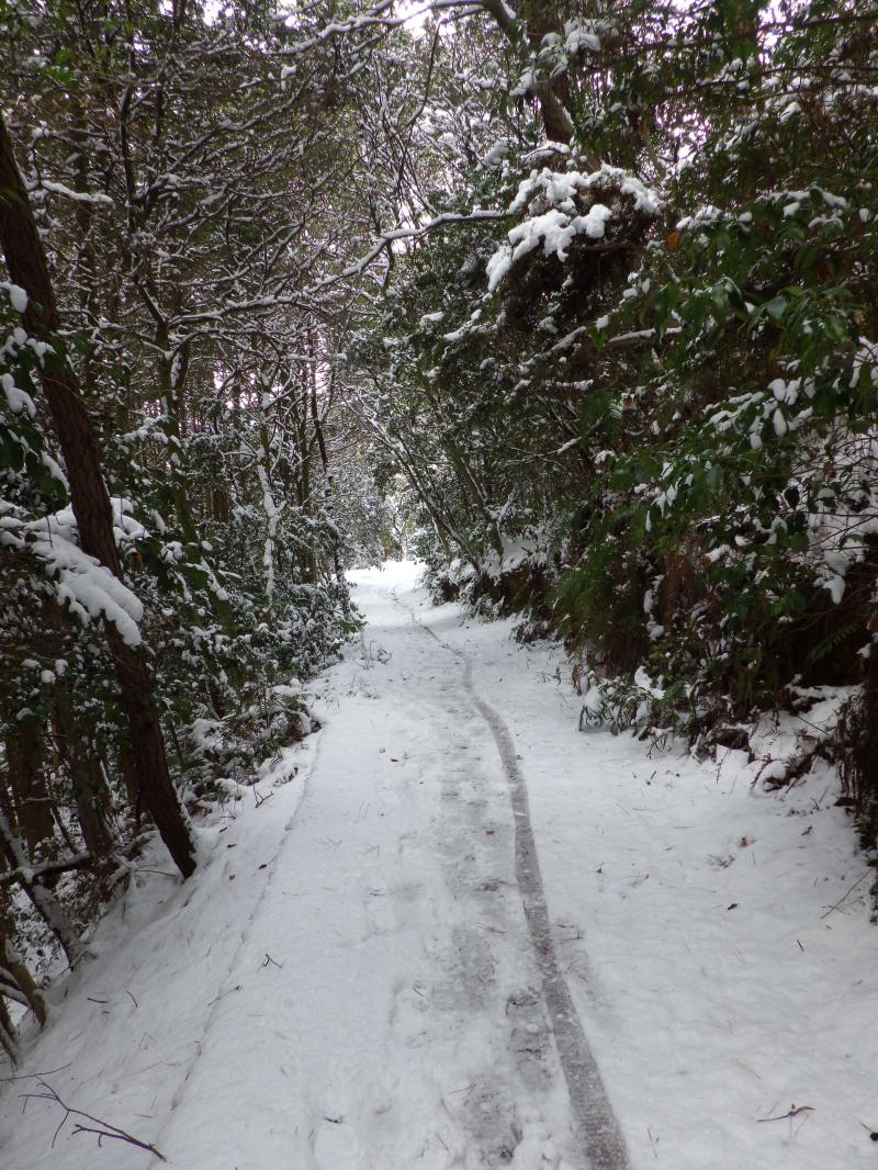 愛宕神社からの健脚コースは短いながら階段が続く急な登山道です。登山口からほんの数分で雪がちらほら出てきて、歩きには全く支障はないですが、山頂近くの公園は真っ白でした。下界から見た感じとはえらい違いで、公園から山頂へ向かう道は凍結していて、ここはチェーンアイゼンがあれば楽だと感じました。