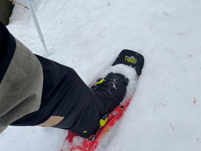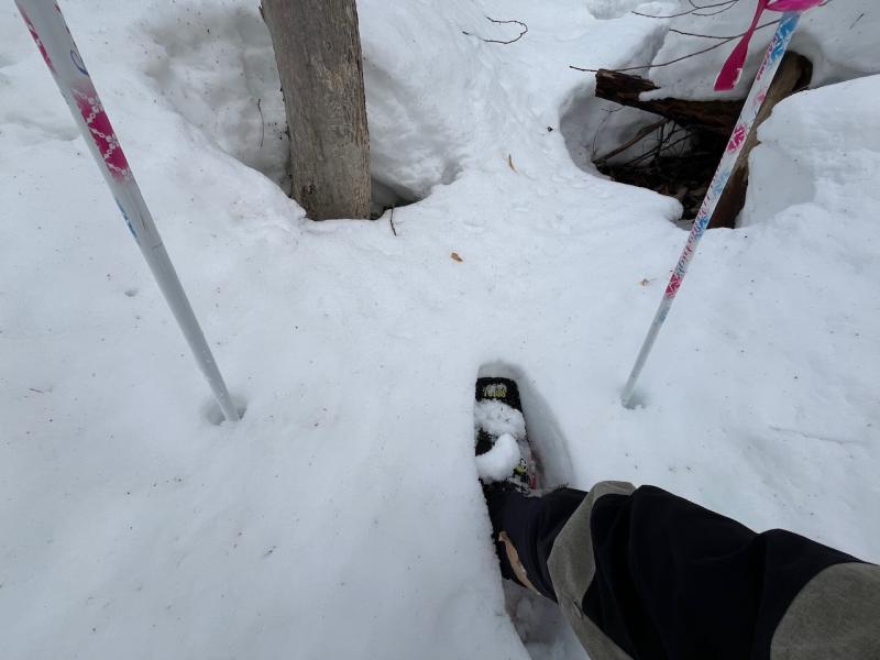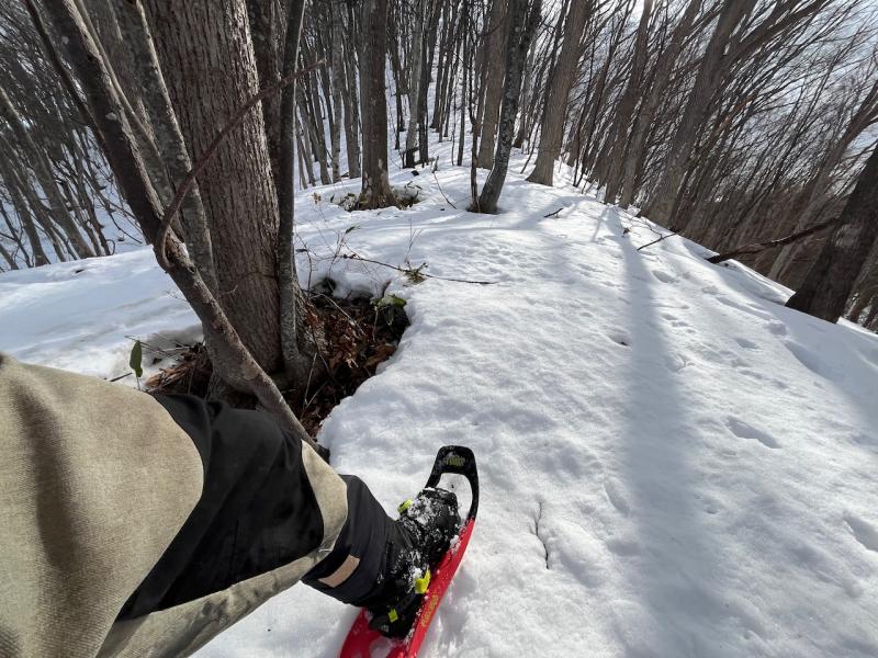 雪解けが進み、グズグズの残雪ハイキングでしたが、スノーシュー着用で快適に登れました。