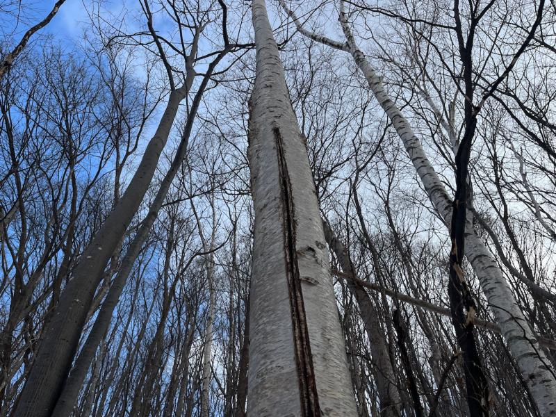 「山用の保温ボトル」に入れてきたお湯を飲んで小休止していると、野鳥が木をつつく大きな音が聞こえてきて、独特の鳴き声が響きました。