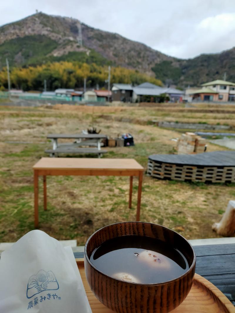 お楽しみのみきやは、お外のベンチで食べるスタイル。今歩いてきた長尾登山道を見ながら、今日はぜんざいとコロッケをいただきました。