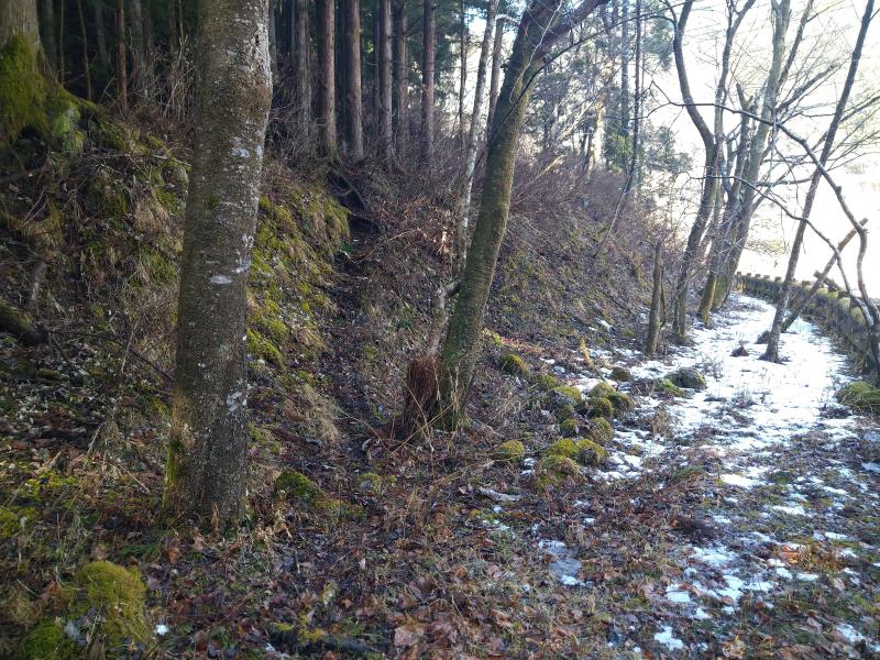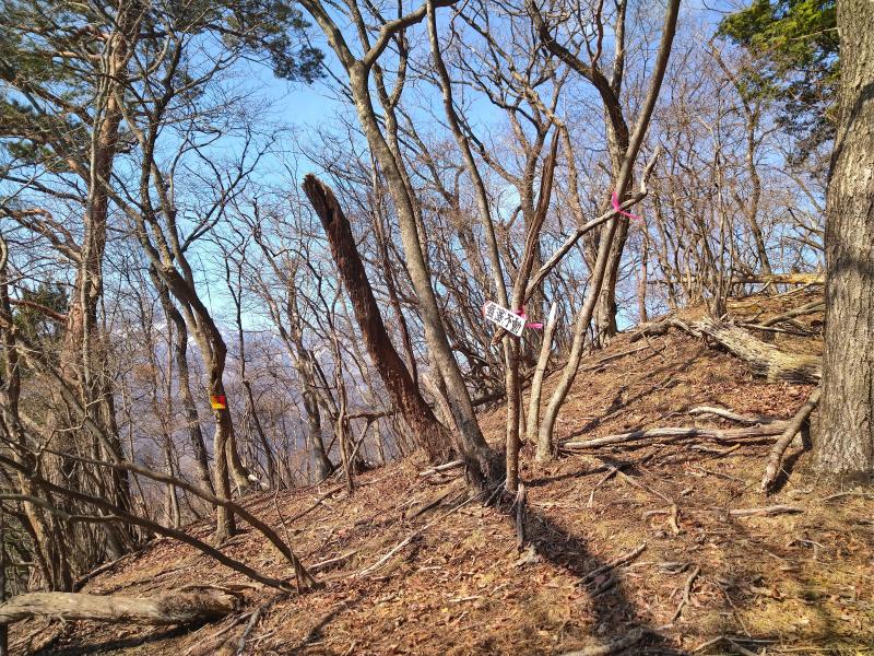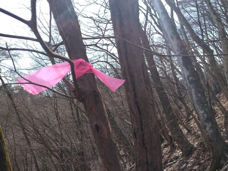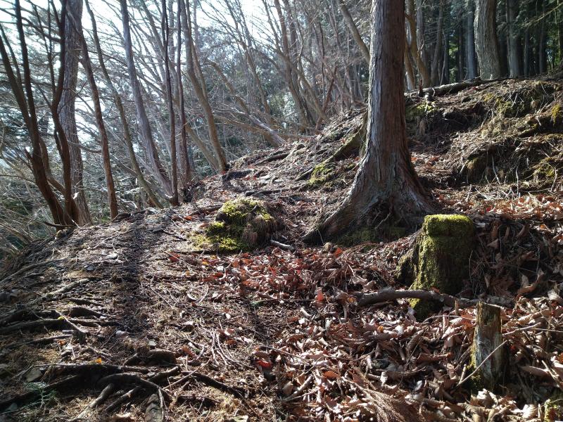 登山道未整備だか修験道と重なる部分もあるので時々歩く人がいる程度。一部、斜度が20度くらいの急斜面があり薄い踏み跡程度。道標はない。