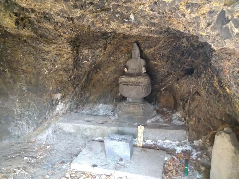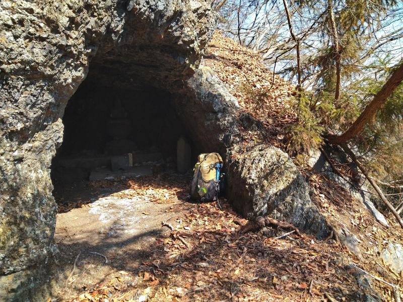 入山から1時間ほどで【岩屋観音】に到着。山中の岩場に掘られた洞穴に観音様が安置されている場所で日光修験道の一部に位置し、日当たりも良く風も吹かないので休憩適地でもあります。登りのルートから一旦離れますので登るのに必死になっていると見落としてしまうかもしれません。