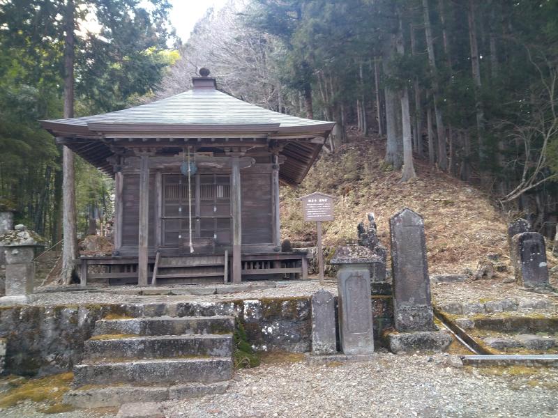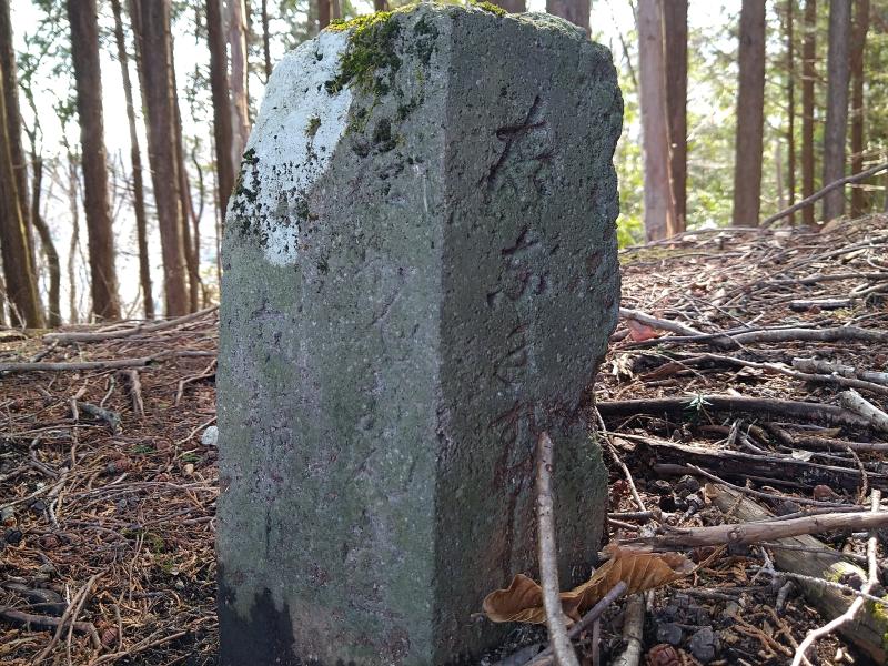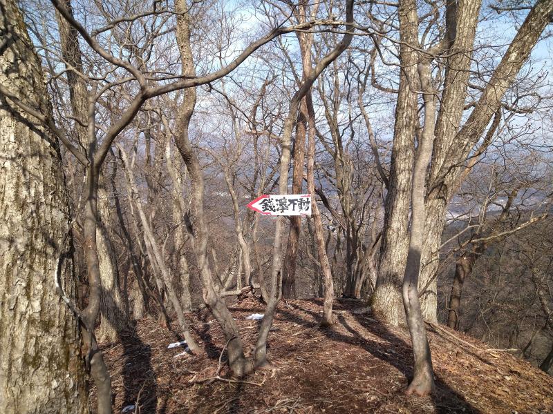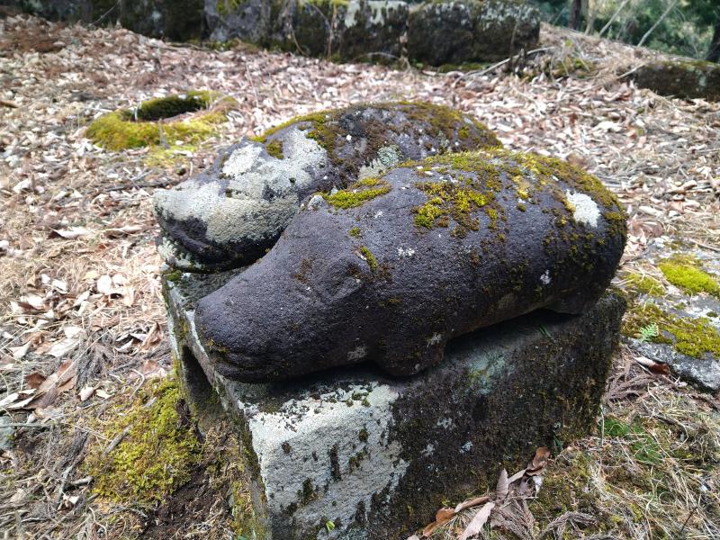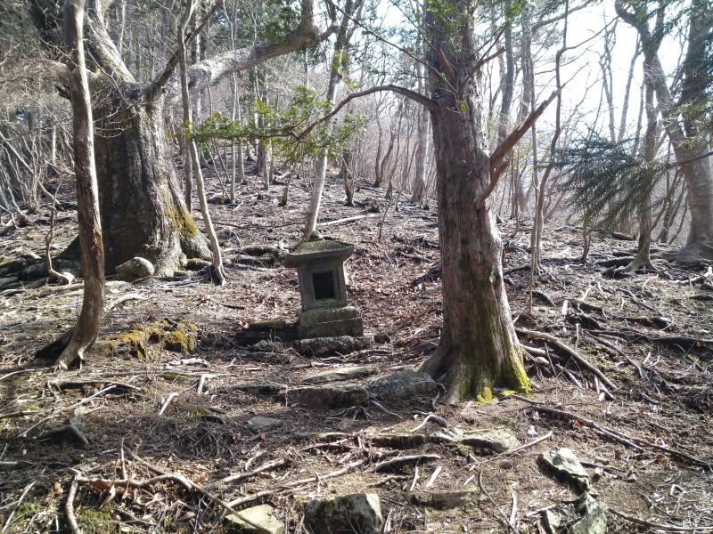 帰りは【銭澤コース】を辿ることにしました。【合峰】と【銭澤不動尊】を繋ぐコースでかつては【山と高原地図】にも表記されていましたが今は表示も消え 廃道扱いで歩く人も稀となっています。それでも中曽根と違っていくつか案内はまだ残っています。登りの時は兎も角下りの際には見落とさないようにしてください。【合峰】から一般登山道を分けて直ぐに急斜面の降下となります。トラロープはありますが いつ設置されたものかわからないので頼らずに慎重に下ります。ここも地面が凍結していました。下りきると小さな祠があり そこからわずかで【化星の宿】という修験地になります。ここにも先ほどより大きい祠があります。そこから5分程度で【銭澤不動尊】への分岐です。枝尾根に入るのが【銭澤コース】ですが今回は枝尾根に入らず真っすぐ下り鉄塔を越えて愛宕神社の【イノシシの狛犬】がかわいい【瑠璃殿】まで下山しました。