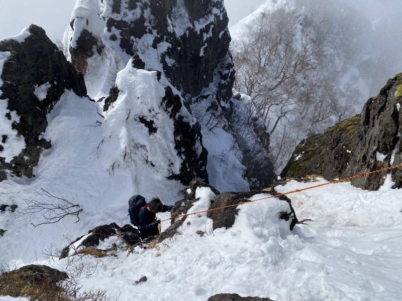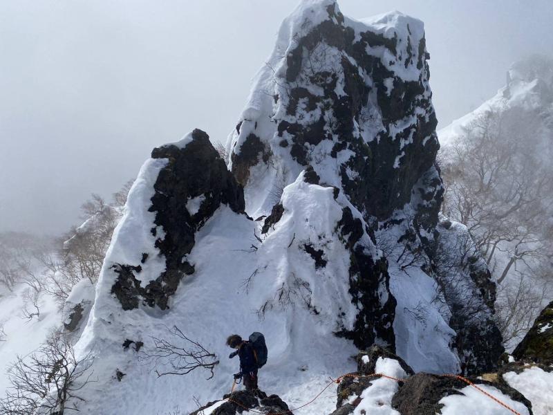 滑落と踏み抜きとの恐怖に打ち勝ち、