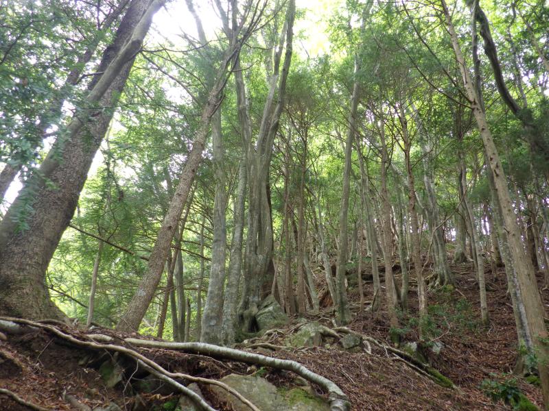 ⑯主稜線まで最後がまだ急坂です。主稜線分岐にマーキングはありますが、とてもわかりづらく、上から見た時にここを下るのかと問いかけたくなる尾根です