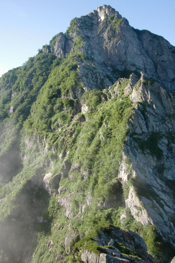 山頂から少し進めば、乳岩側から見るのとは違い、三ツ瀬明神山のかっこいい姿が拝めれます(今回はこの先の湧き水はパスしました)。