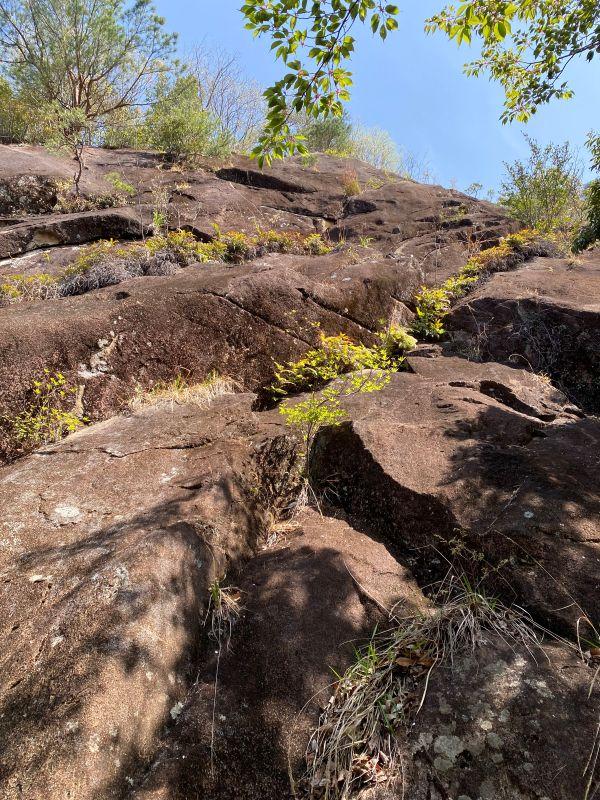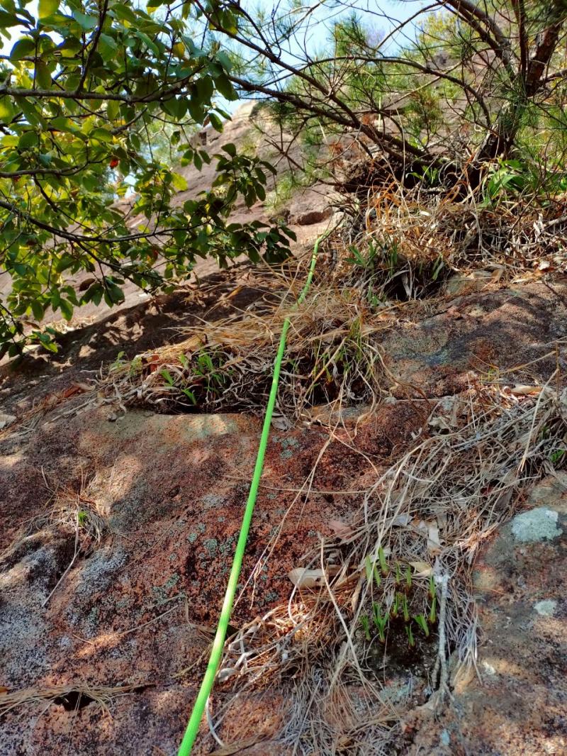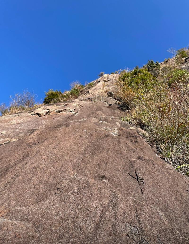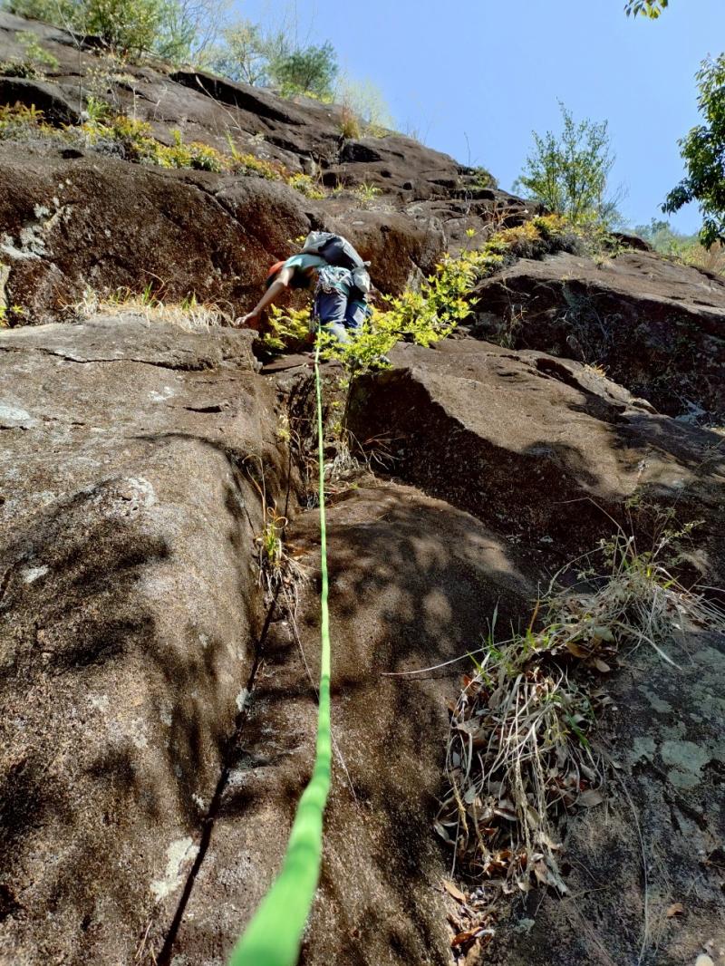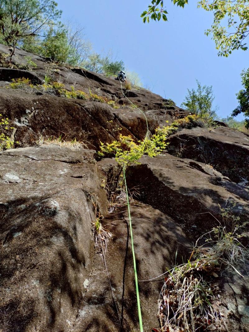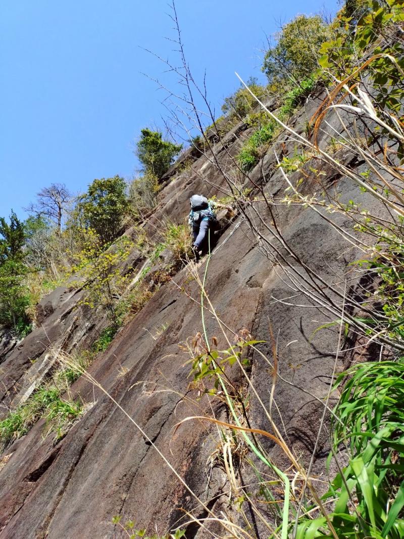 基本的には草付きの少ないラインを登りますが、3P目のトラバースセクションを終えた後に藪があり無理やり突っ切りました。ここでラインを間違えたようです。