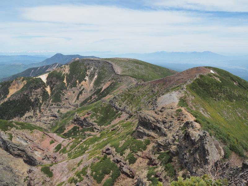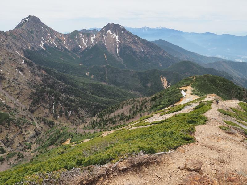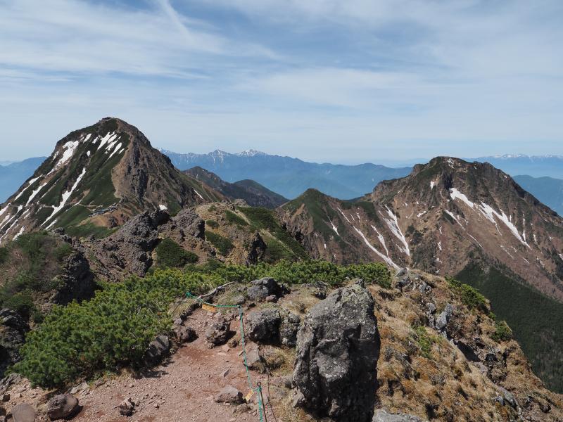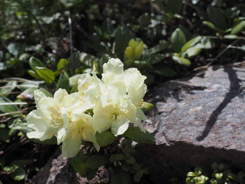 横岳に向かって、鉾岳のトラバースに念願のツクモグサ。ここはいつも複数咲いていますが日の光が届ききっていないのか花は閉じ気味。稜線の花はまだ少なめな印象です。ツクモグサ以外にはオヤマノエンドウ、キバナシャクナゲなどが咲いていました。三叉峰で小休止。北アルプス、信越五岳等眺めながら軽食。横岳を通過して硫黄岳へ。さすがにまだコマクサは咲いていませんね。太陽は射してますが、ちょっと雲が多くなってきて風が強くなってきました。やはり硫黄岳周辺は風が抜けます。