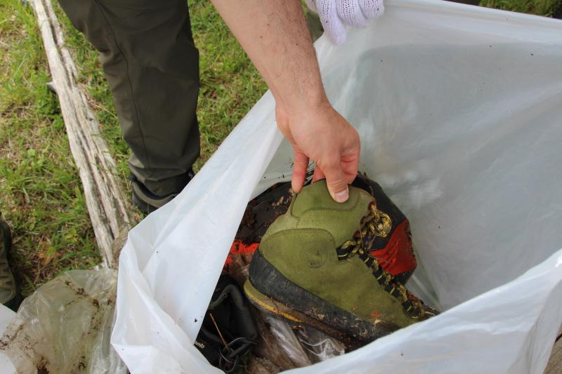 市ケ原付近に来ると、河原でBBQをしている影響か、飲食系のごみや建物周辺にある年代物のガラス瓶や朽ちたビニール傘などを回収しました。