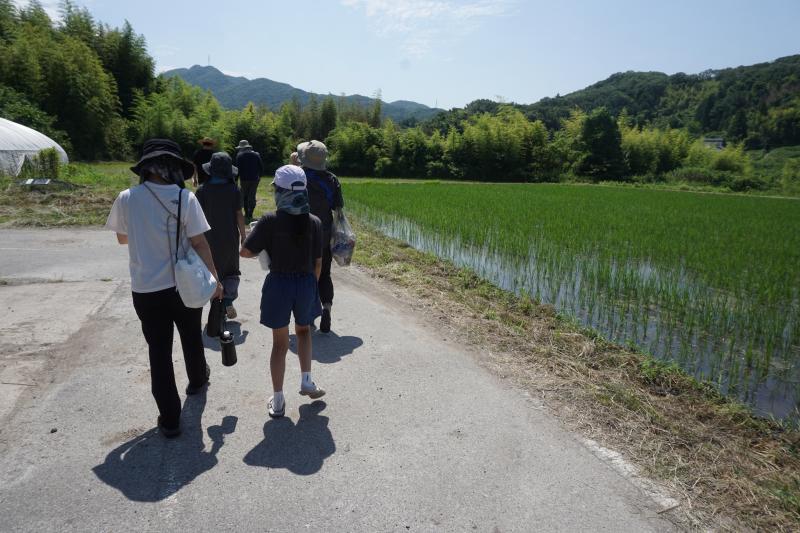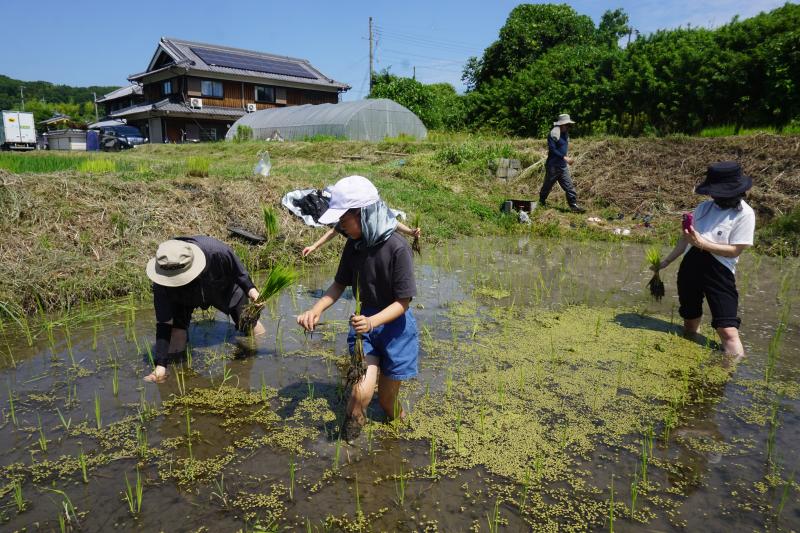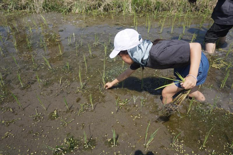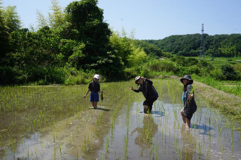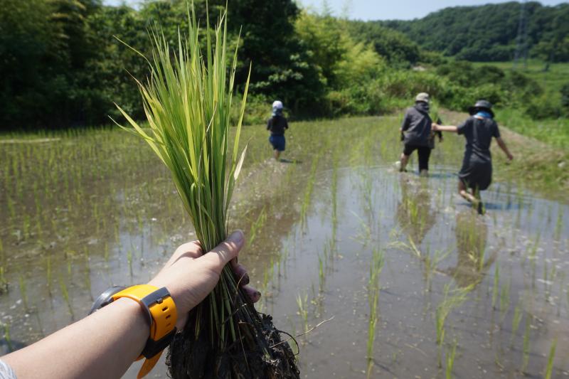 裸足でもいいのですが、田んぼにしたには小さな石などがある場合もあるので、長靴か処分しても良いハイソックスを履いていた方がベターです。