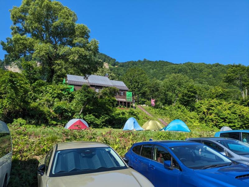 雨飾高原キャンプ場。駐車場も広くトイレも完備。この宿泊施設にも泊まってみたいです。