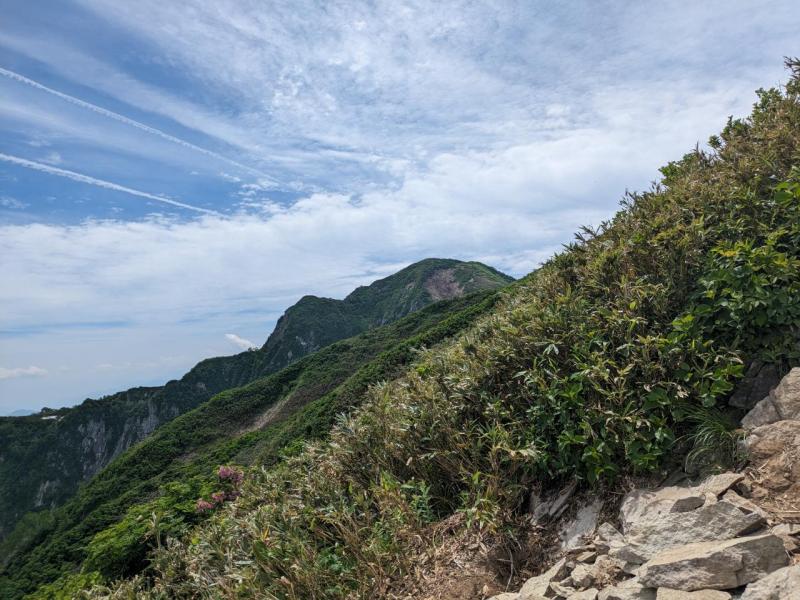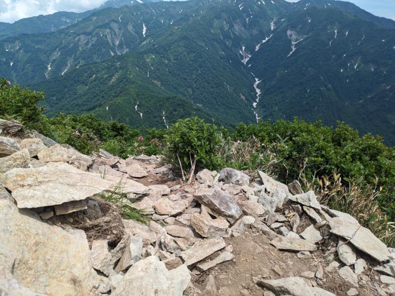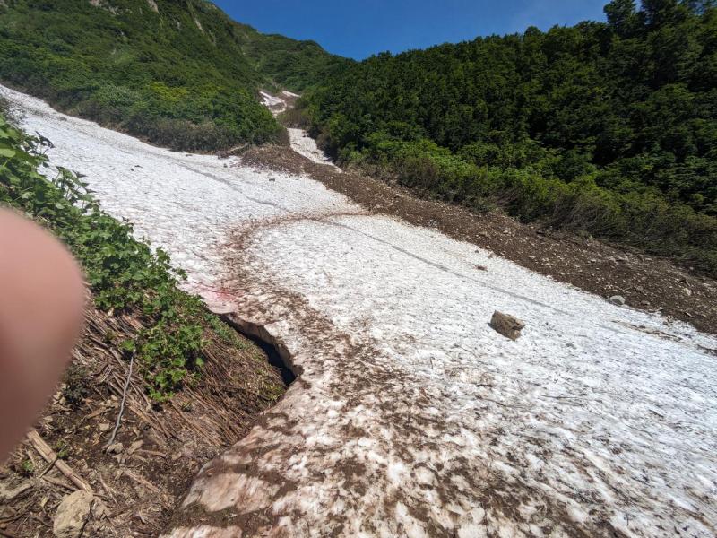 雪渓は3か所くらいあった気がします。気を付けて歩けば問題ないです。雪渓を吹く風が心地よいです。
