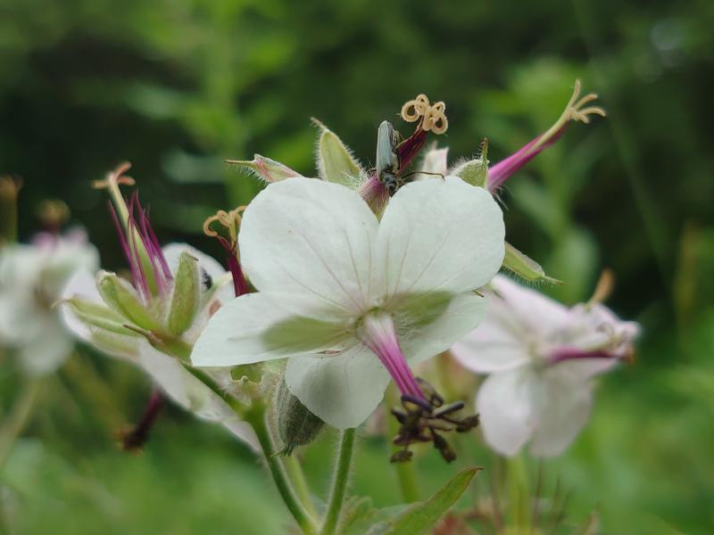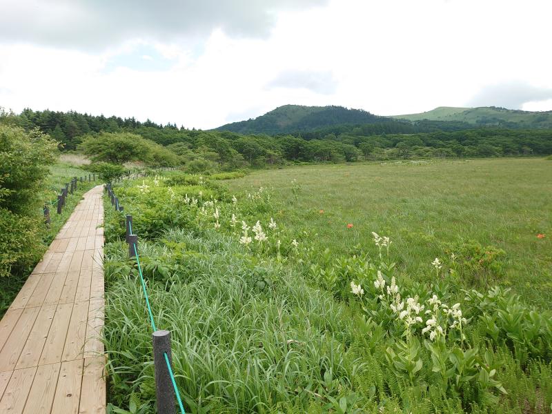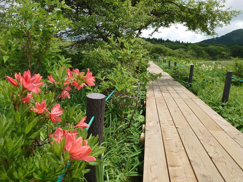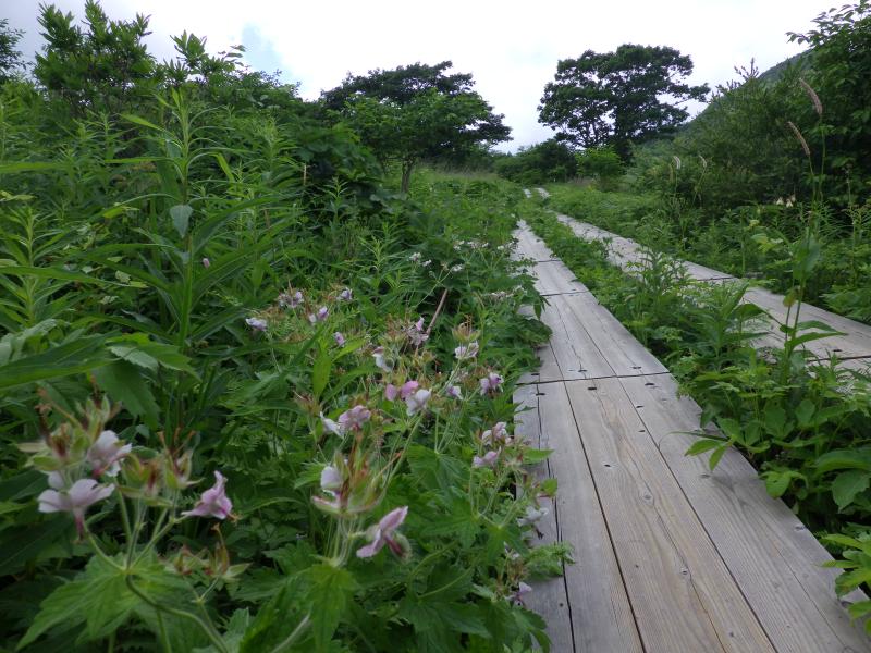 八島ヶ原湿原の周遊コースはほとんどが木道歩きで傾斜もほとんどありません。今のシーズンはレンゲツツジ・コバイケソウ・グンナイフウロが見頃でニッコウキスゲは少しだけ開花している感じです。コバイケソウは今年は当たり年ということで、湿原の奥の方で白い花が咲き乱れています。三分の一くらい歩くとトイレがある車山方面分岐がありますが、この先はしばらく未舗装林道のような道になりますが、グンナイフウロが群生になっています。途中でヒュッテみさやまへの分岐があり、その先で再び木道に変わります。