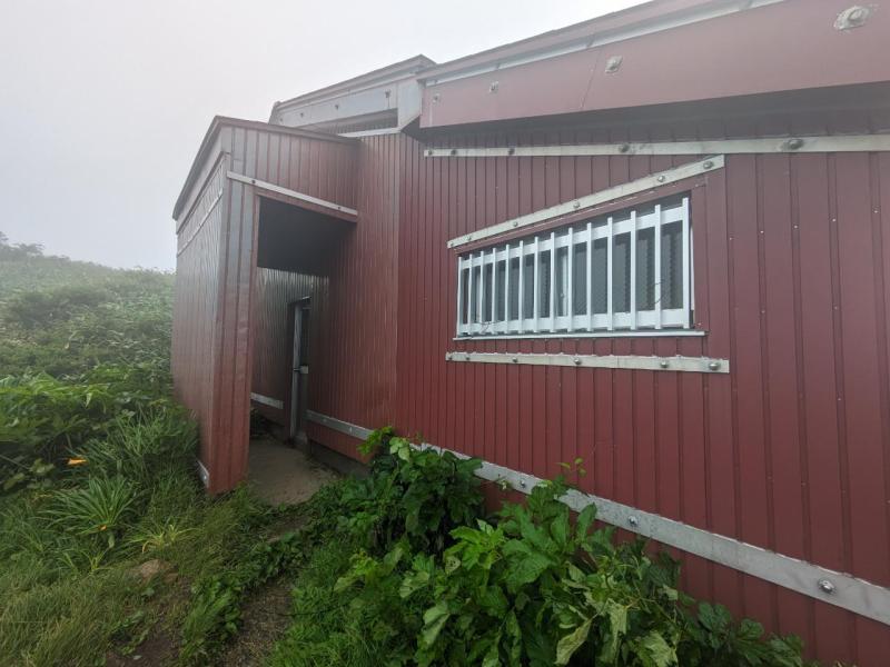山頂から避難小屋までなだらかな下りが続き、避難小屋へ到着。