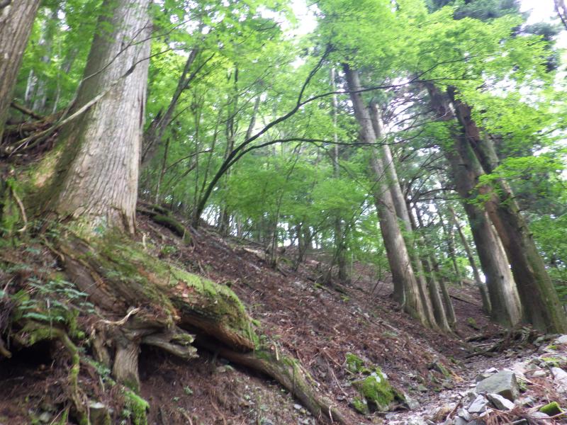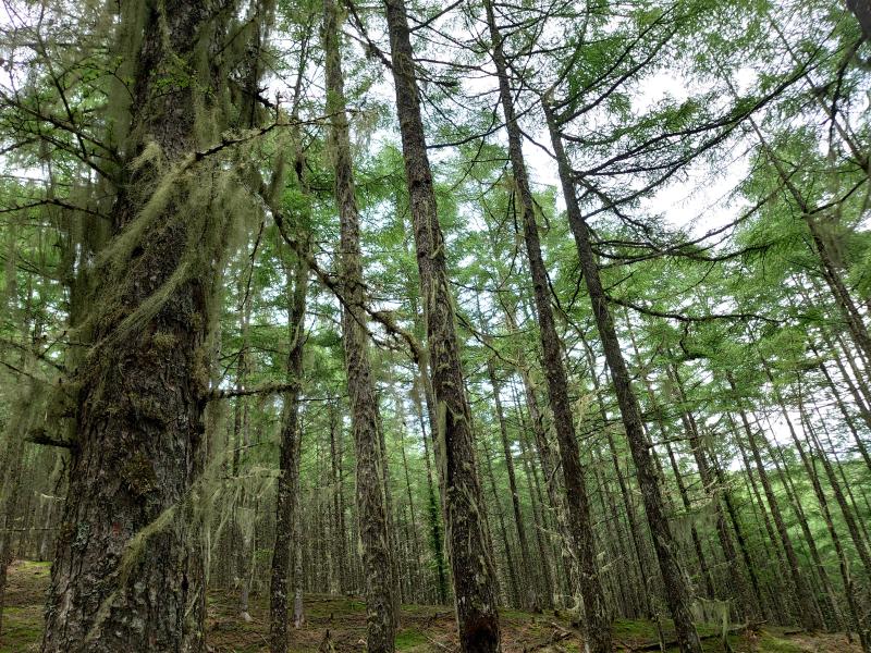 ⑧山頂へは最初はサルオガセの森から始まり、しばらくするとカラマツの深い樹林他を進みます。左手はガレでロープが張ってあります。