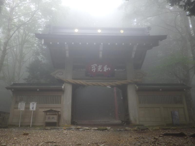 ⑤46丁目の和光門から境内に入り、鐘楼を左へ行くと御光遥拝所のある隋身門49丁目になります。ここから富士山が正面に見えます