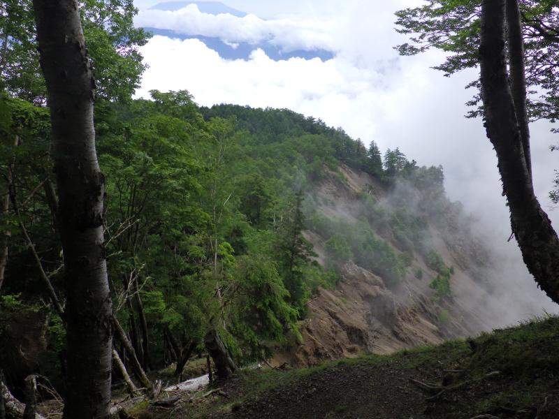 帰り道、ガスっていて最初はわかりませんでしたが、東側は実は大ガレになっていて、下山時にわかりました。ここでも富士山の先端の一部が見えていましたが、最後まで姿を現さず、、、。