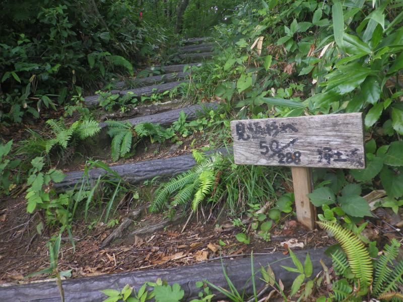 峠はガスが上がっていたので、金沢市街方面は見えず、逆に富山側は砺波の散居村が見えました。峠からはいきなり浄土坂という階段の急登から始まり、登りきると見返杉の展望所になります。ここからは登り下りを繰り返しながらですがあまり傾斜はなく、楽に奥医王山の山頂へ到達できます。山頂には展望台がありますが、展望状況は変わらずで残念。奥医王山周辺は自然林が豊富で森も深そうです。