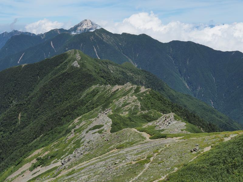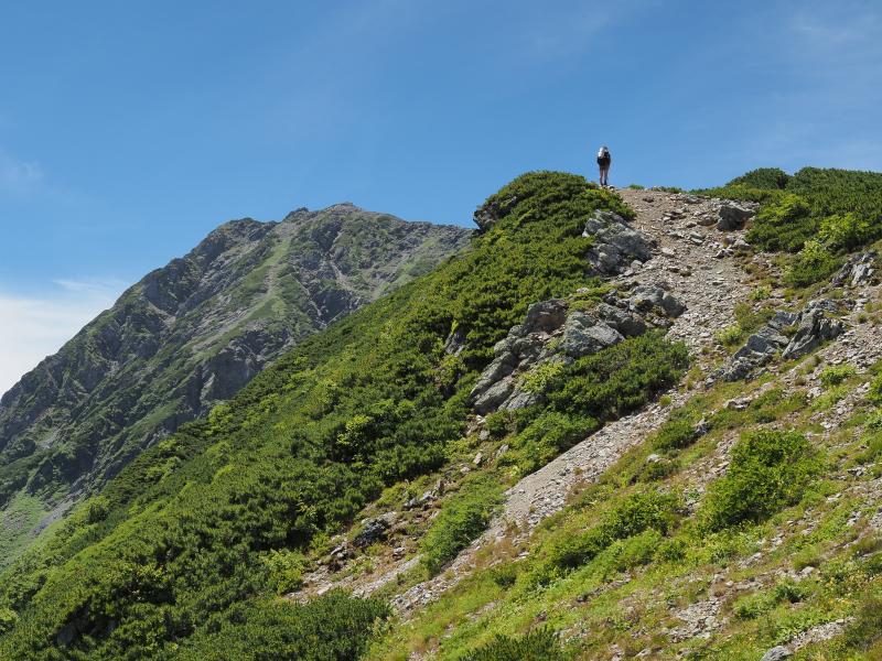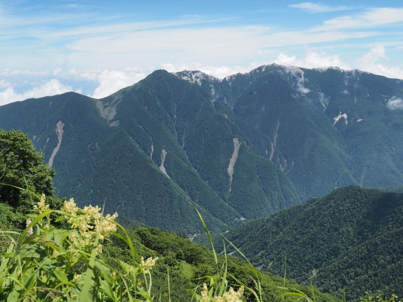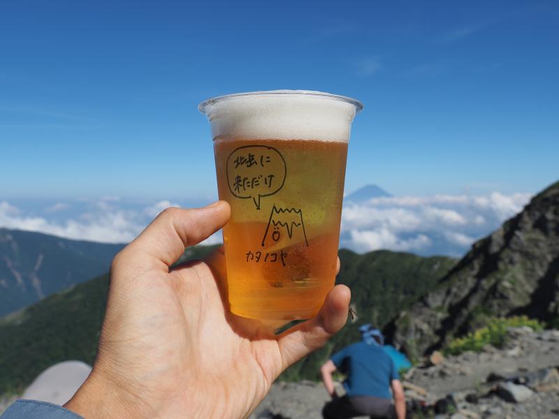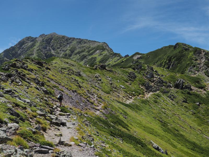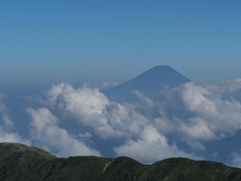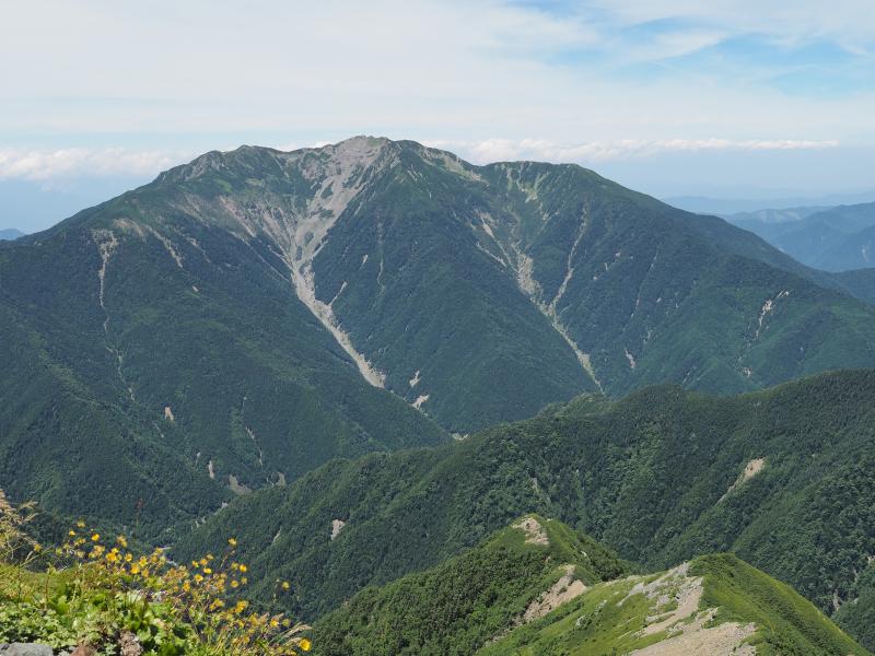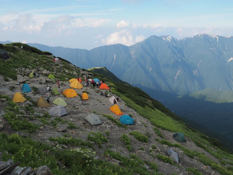 1日目は気持ちの良い晴れで日差しが強く、草すべりは寝不足なのか熱中症なのか調子悪くペースが上がらず。シモツケソウやハクサンフウロ 、タカネナデシコ、シナノオトギリ、ミヤマアキノキリンソウ、マルバダケブキ等高山植物は沢山咲いていました♫稜線に出ると鳳凰三山、甲斐駒ヶ岳、仙丈ヶ岳、富士山が素晴らしい。肩の小屋に着いて早めにテントを張り、日傘で日陰を作り外で昼寝。昼寝したら調子も良くなりビール飲んだり写真撮ったりと快適なテント泊。がしかし、夜からガスガスになって星空も全然見えませんでした。