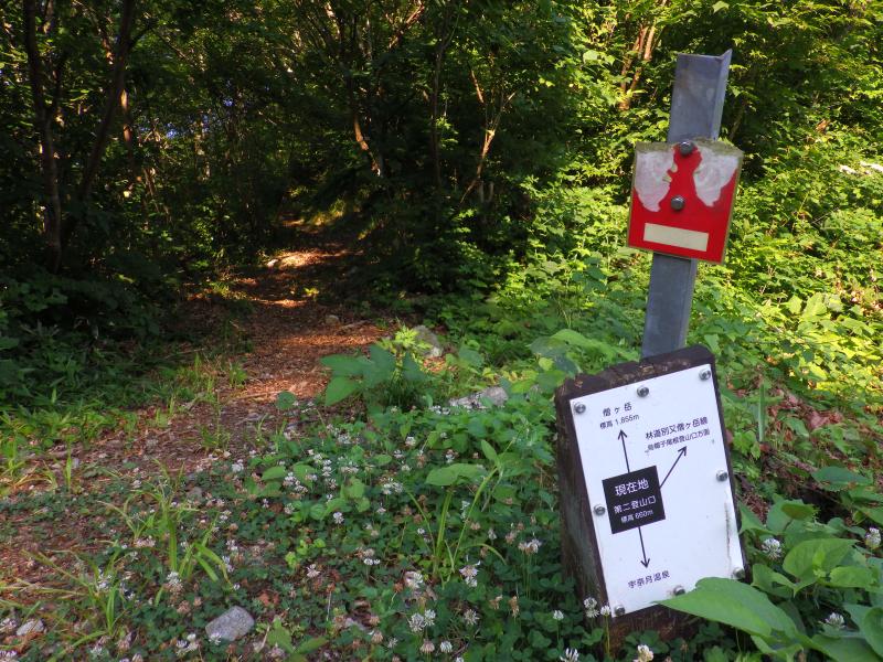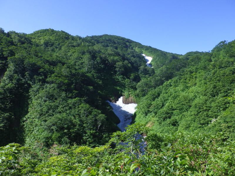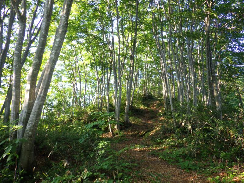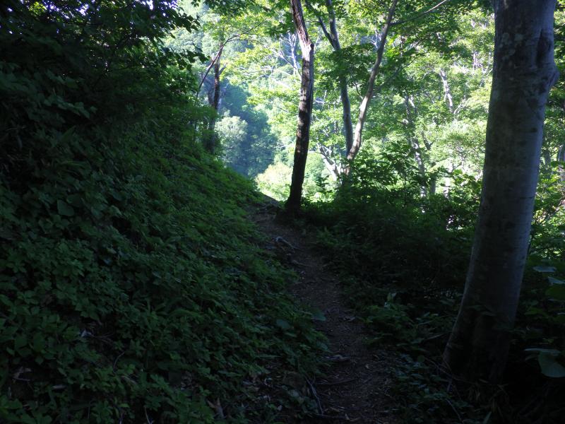 実は第二登山口から第三登山口が急登で最初のスタートではりきり過ぎると後でばてます。最初は涼しかったものの、風の吹かない樹林帯ではすぐに汗が吹き出します。第三登山口まで1時間とペースは上々。第三登山口から烏帽子尾根分岐までも尾根をひたすら登って行きますが、向かって左からせまってくる山並みを登るのかと思っていたらどうやら登らなくて済みそうで、右の尾根に移って行きます。途中、雪渓が残り、残雪箇所を歩くと涼しさがあります。