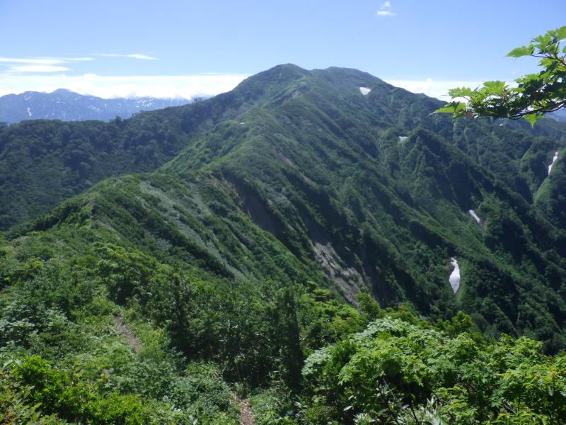 第三登山口から前僧ヶ岳まで2時間10分。ようやく僧ヶ岳と越中駒ヶ岳の姿が見えてきました。目標の越中駒ケ岳への稜線がきれいに見えてきましたが、遠いような近いような。