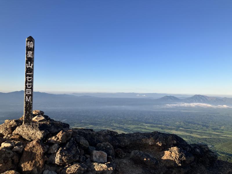 稲星山では、阿蘇の山々を望む大展望。雄大な景色に息を呑み。