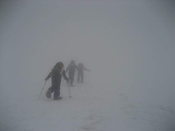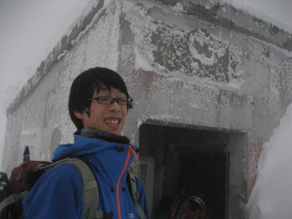 六合目~頂上 風の影響をかなり受けます。整備されている目標の旗を見失わないようにすることが大切です。頂上避難小屋は雪にしっかり埋まって使えません。