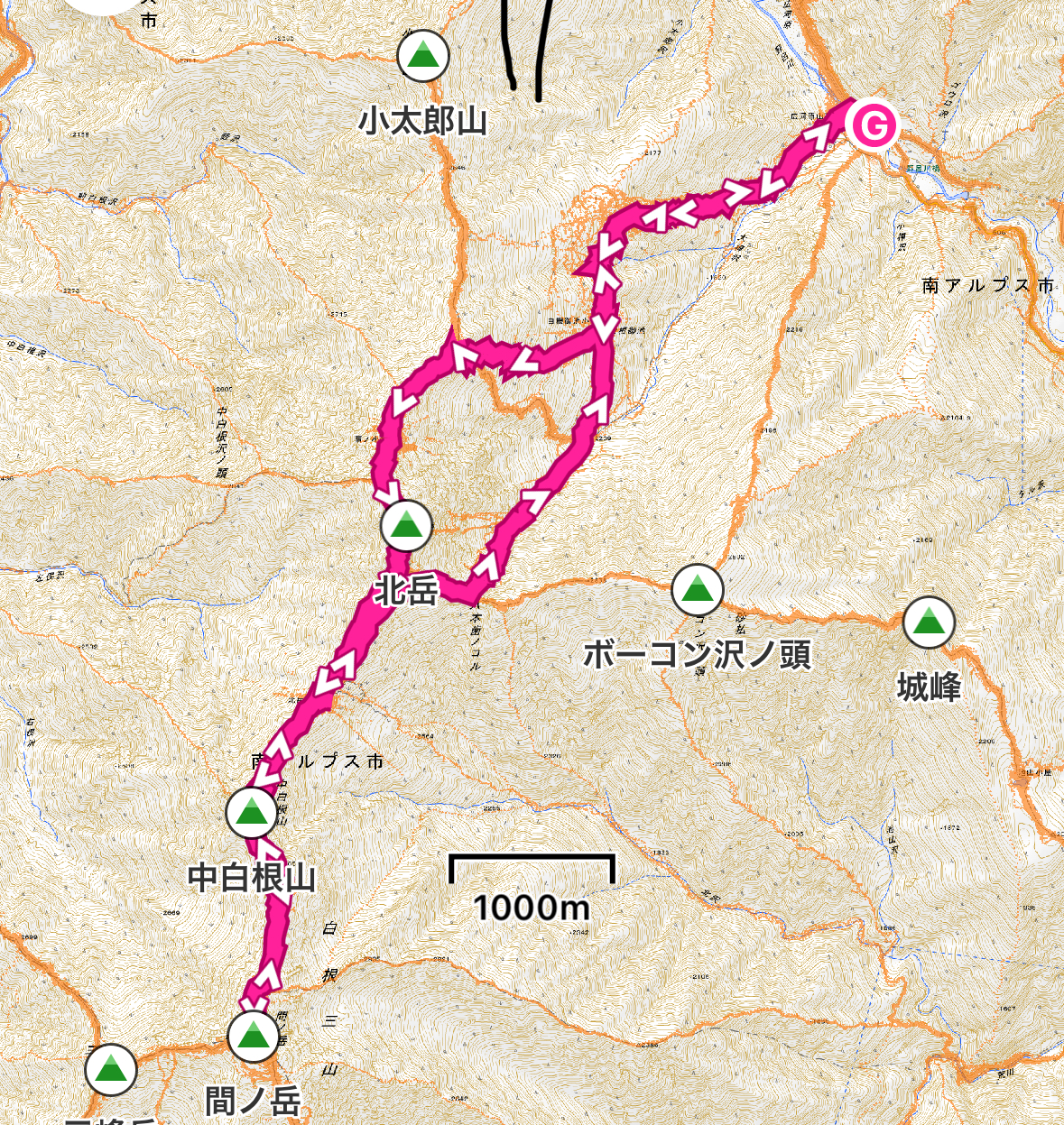 北岳山荘-85-間ノ岳-80-北岳山荘-60-八本歯のコル-120-白根御池小屋-115-広河原