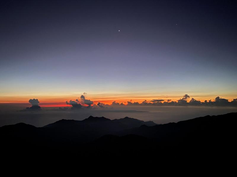 白み始めた空は、水平線よりやや上の空間で濃紺から白、橙へと変化する連続的な諧調をたたえて、変わらない山の営みを兆しています。