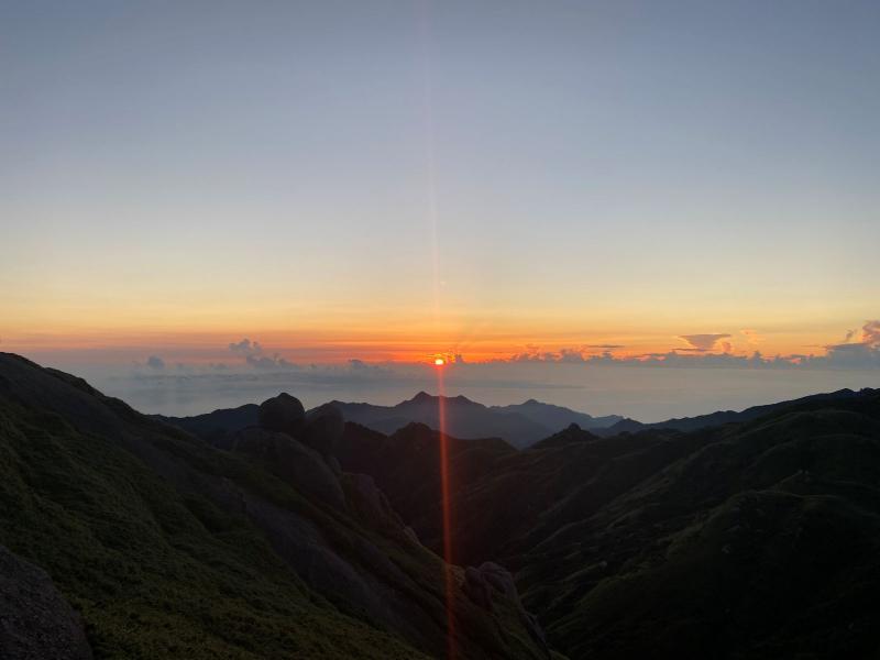 濡れた笹薮に下半身をズブ濡れにされながら岩の急登を上がりきり永田岳の頂上に着くと、空が一段明るくなりちょうど日が上がりました。宮之浦岳の端正なシルエットが逆光の中に浮かんで見事です。しばらく呆けたように休憩し、復路に備えます。
