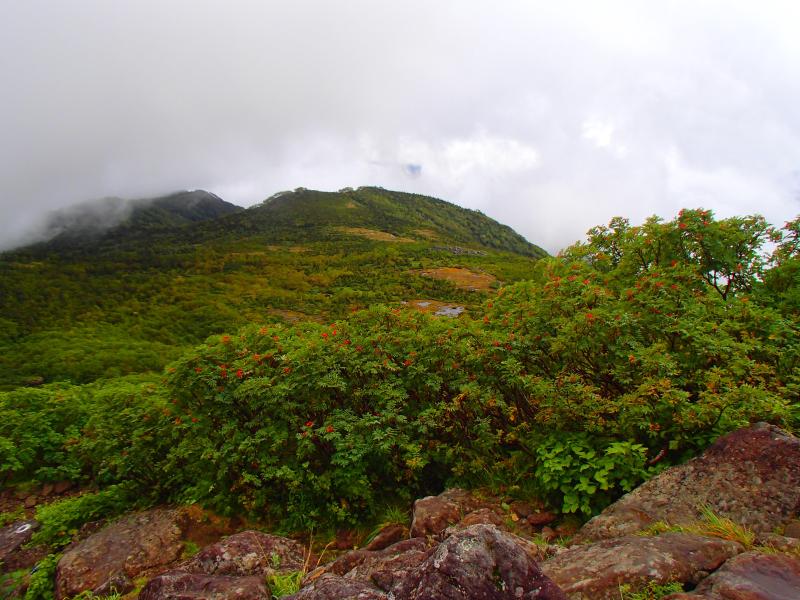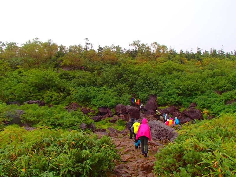 天狗原の木道を歩き切ると岩の多い登山道に変わります。雨で濡れて滑りやすくなった岩を慎重に登りました。