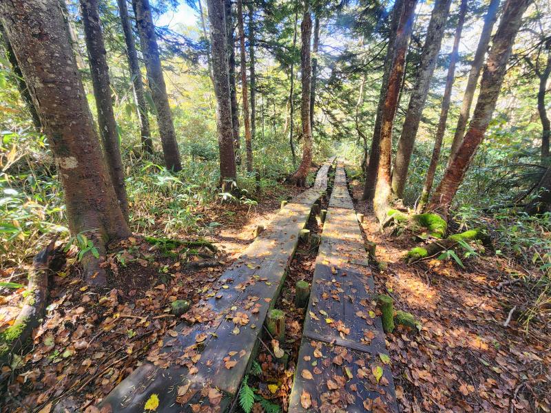 - ○鳩間峠から横田代へ行くにはLUCYの先、右手にある登山口を登ります。雨の後は泥濘が酷く木道が大変滑りやすいです。山の鼻へ向かう登山道のように整備されていません。