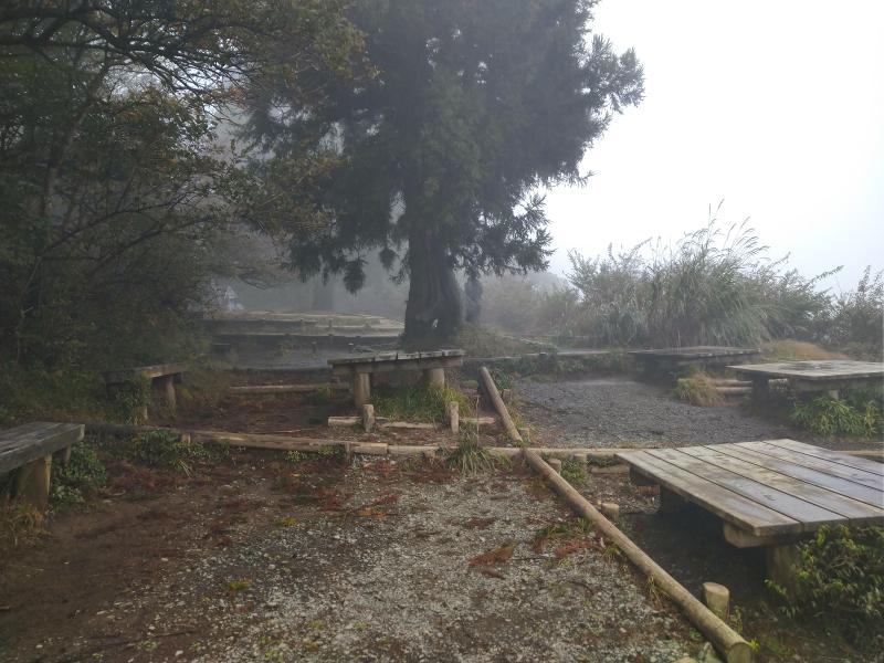 「大山」山頂はベンチがいくつもあり、北側にはトイレもあります。テーブルもあるのですが固形燃料の使用による焦げと溶けが多数見受けられました…以前より増えた気がする…!火器を使用する際には耐熱性のあるテーブルやシートを必ず使いましょう!ここまで軽い休憩だけでさすがに疲れたのでお昼休みも兼ねてゆっくりと休んで…いたのですが山頂だけ雲の中で手がかじかむくらいに寒く20分程で切り上げ。見晴らし方面へ下山します。