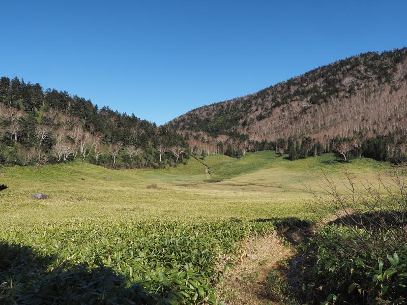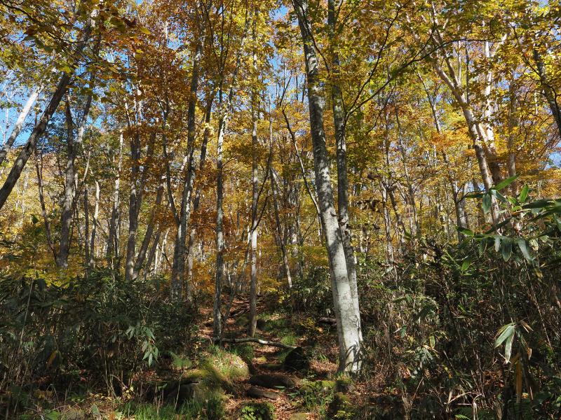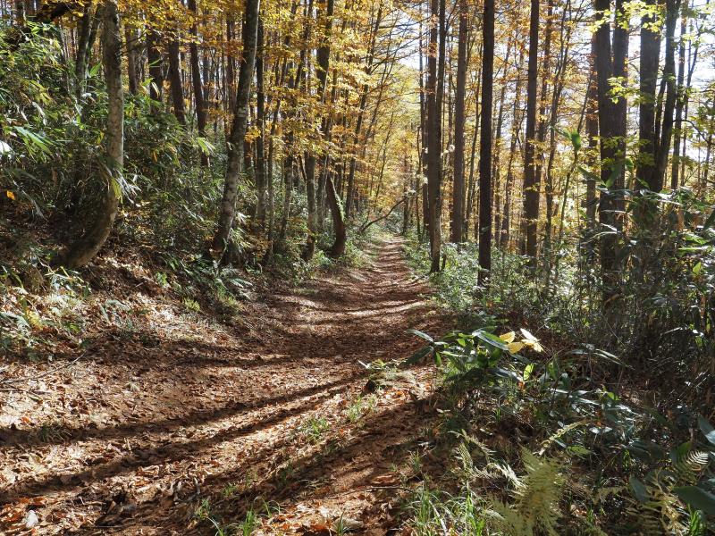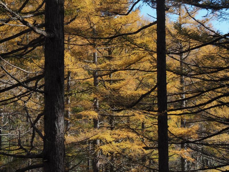 やっと歩きやすい登山道に出て、走れるところは走ります。唐松の黄葉が綺麗ですね。新道分岐からは林道で駐車場へ。後半はなかなか大変な道でしたが登山道・景色にバリエーションがあって面白い山行でした。