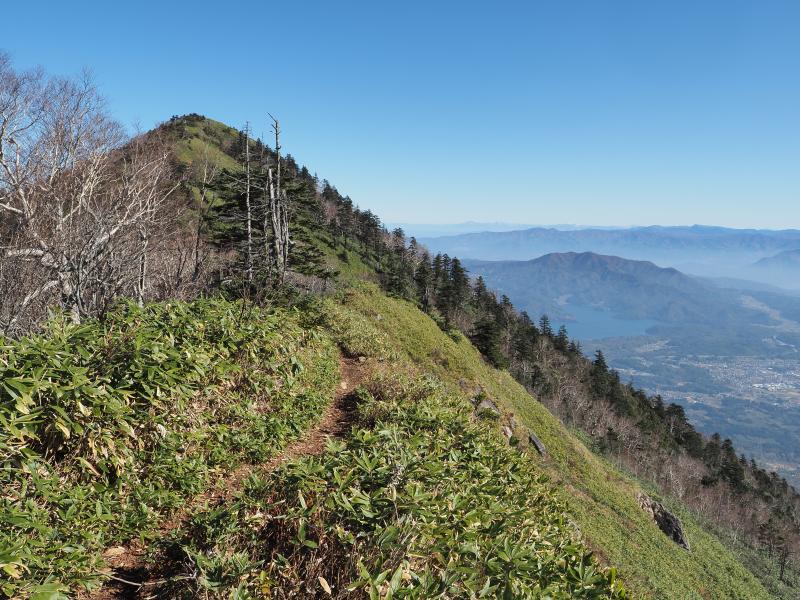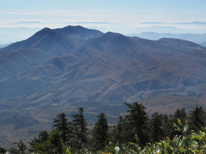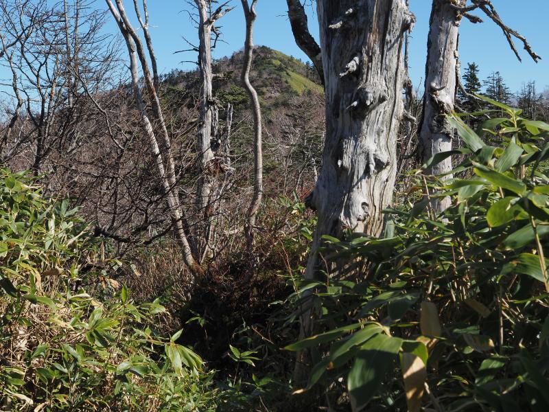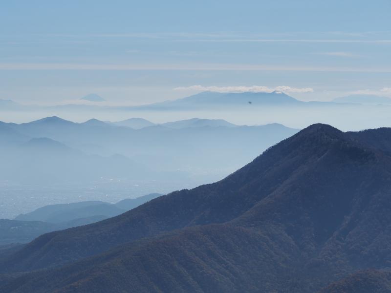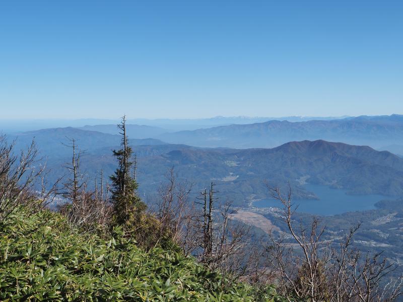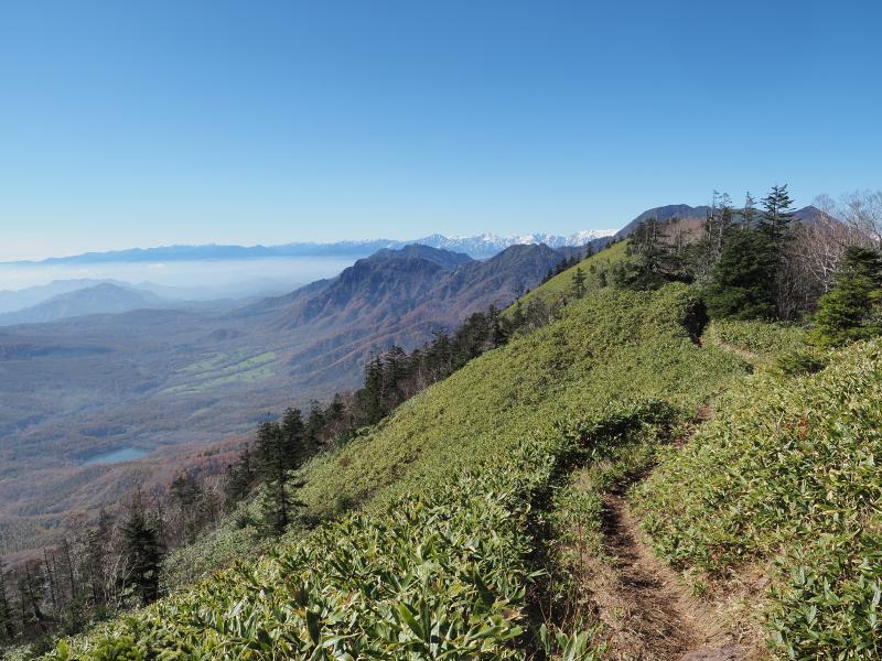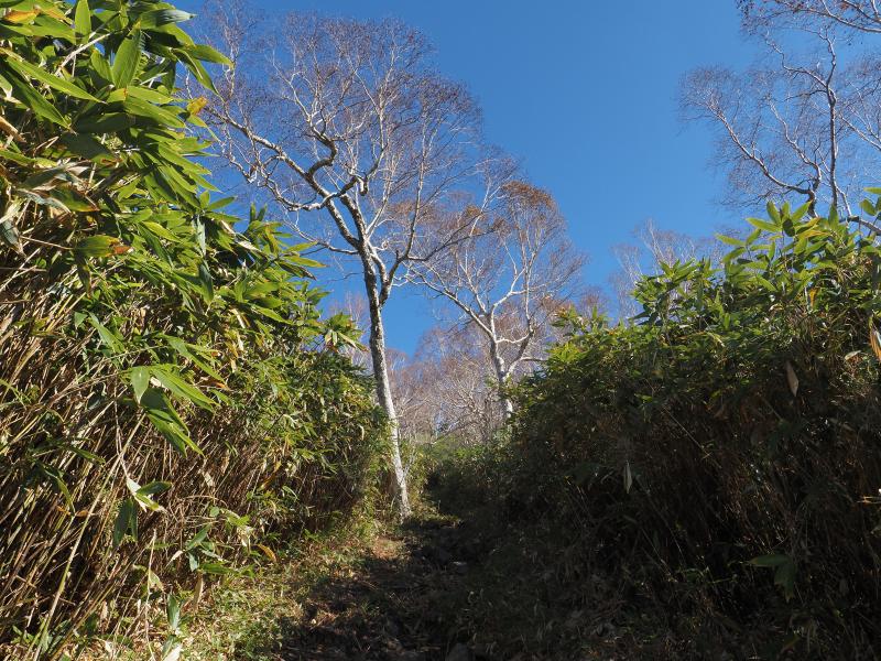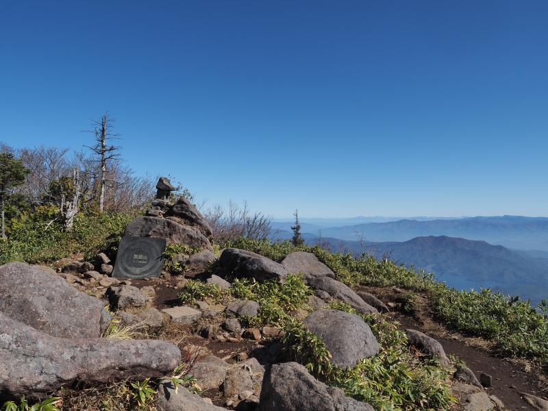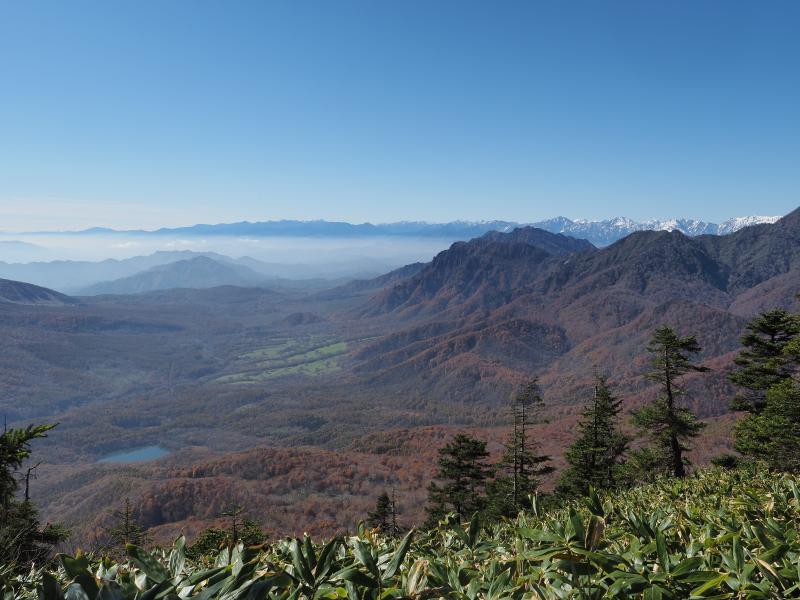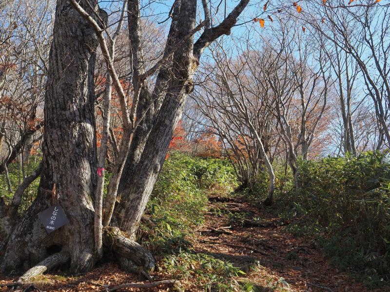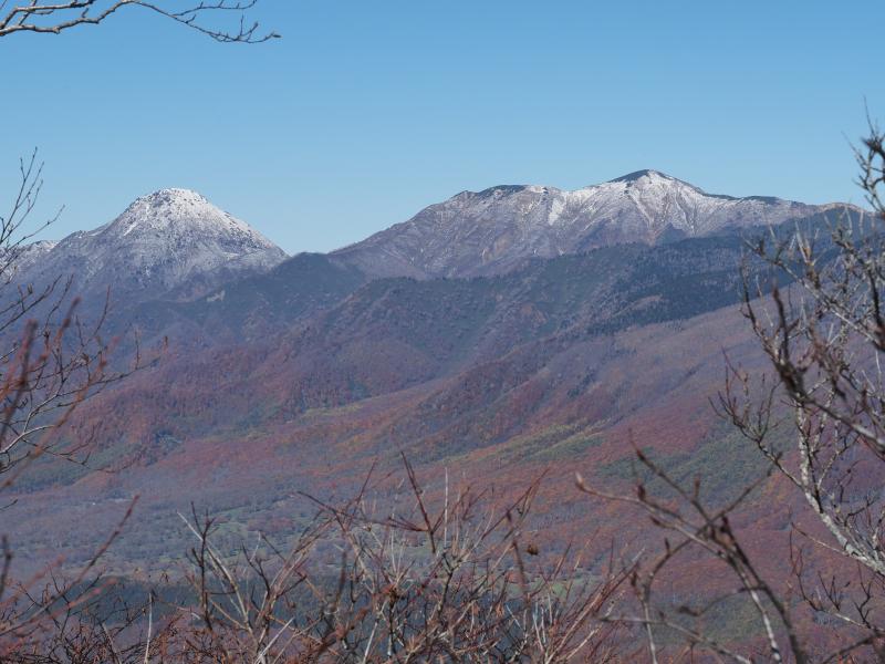 登りは古池を周り新道を通って黒姫山へ。この辺りはもう晩秋で標高1500m未満が見頃といったところ。しなの木を過ぎると急登が続きます。時々止まりつつやっと森林限界を超えると展望が開け、振り返ると戸隠・高妻山の奥に北アルプスの雪景色。後立山連峰は結構下まで雪が付いていますね。下に先ほど通った古池も見えます。火打山や妙高山も冠雪していました。この辺は気持ち良い道ですね。山頂手前に少し岩場もあります。山頂北東側は野尻湖斑尾山から続く信越トレイル、そして遠くには日光白根山や武尊山など群馬の山も白くなっていました。