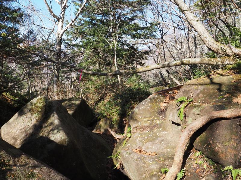 山頂での昼休憩を終え少し戻って、七ツ池・峰ノ大池方面に下ります。苔の生えた岩が多いのと黒姫山も少し雪が降ったようで北側のこの道は雪が残っていました。そして雪と霜が溶けたおかげで滑る滑る。。。なんとか分岐まで下りてきて、まずは七ツ池へ、そして峰ノ大池へ。峰ノ大池を過ぎてしばらく歩くとだんだんとアドベンチャー感のある登山道へ。大きな岩がゴロゴロしるし、苔も生えているしでとても歩きにくい。ピンクテープはありますがどこを通ったら良いのかわかりにくいところもありなかなか大変な道でした。落葉もありなかなか神経使いました。。。
